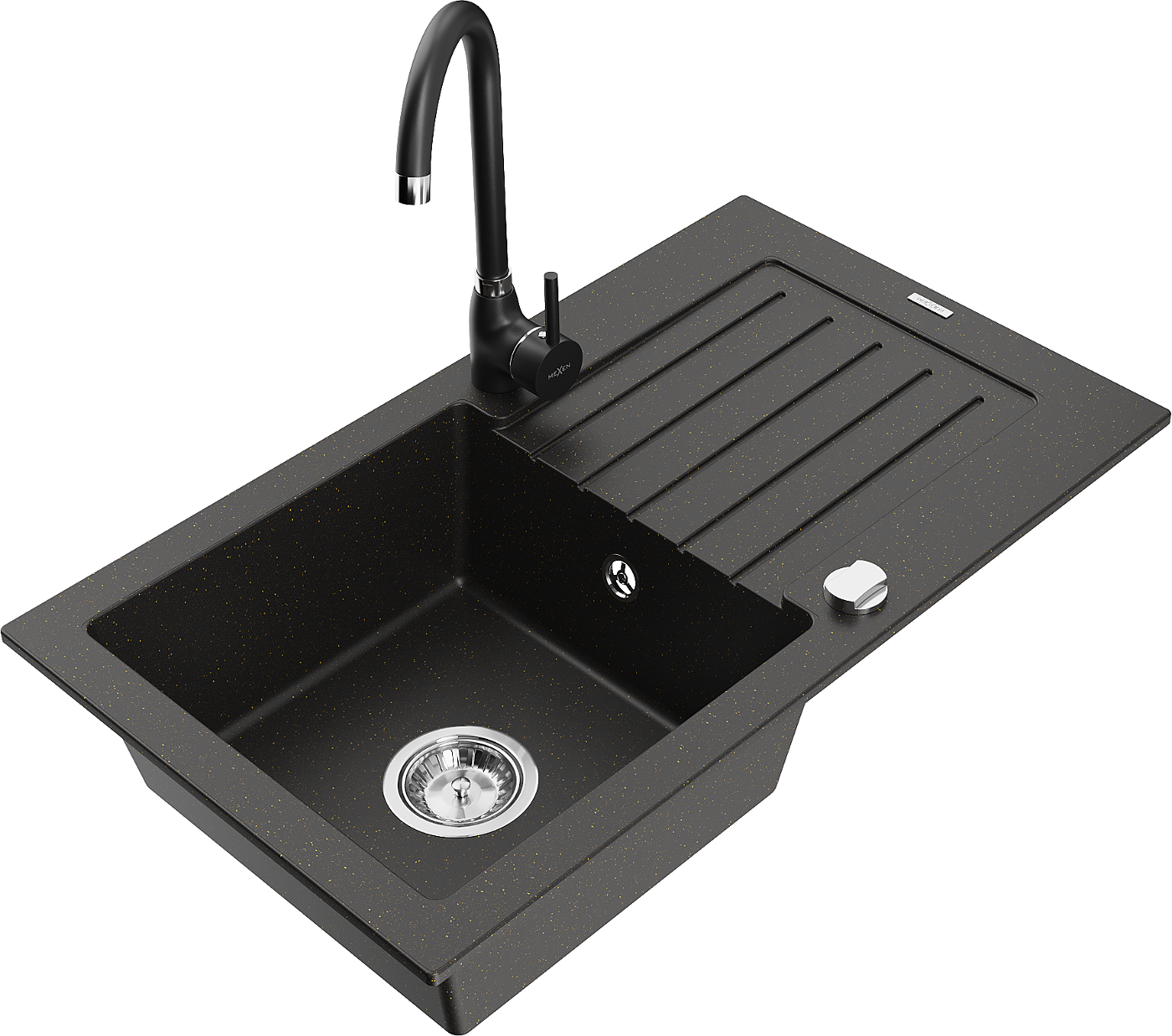 Mexen Pablo chiuvetă din granit cu 1 compartiment cu scurgător și baterie de bucătărie Telma, negru/auriu - 6510-75-670200-70