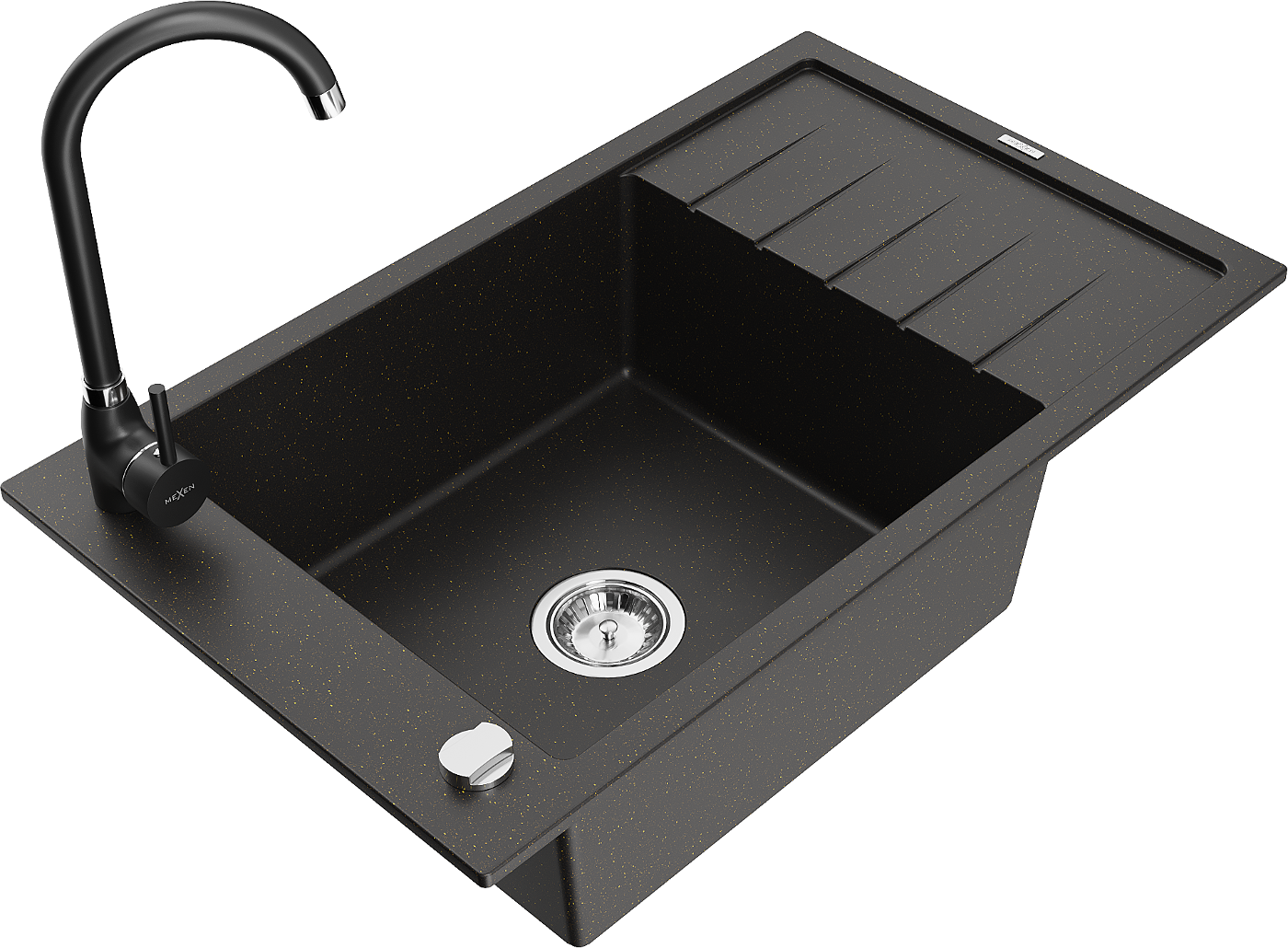 Mexen Elias chiuvetă granit 1-cu bac cu picurător și baterie de bucătărie Telma, negru/auriu - 6511-75-670200-70
