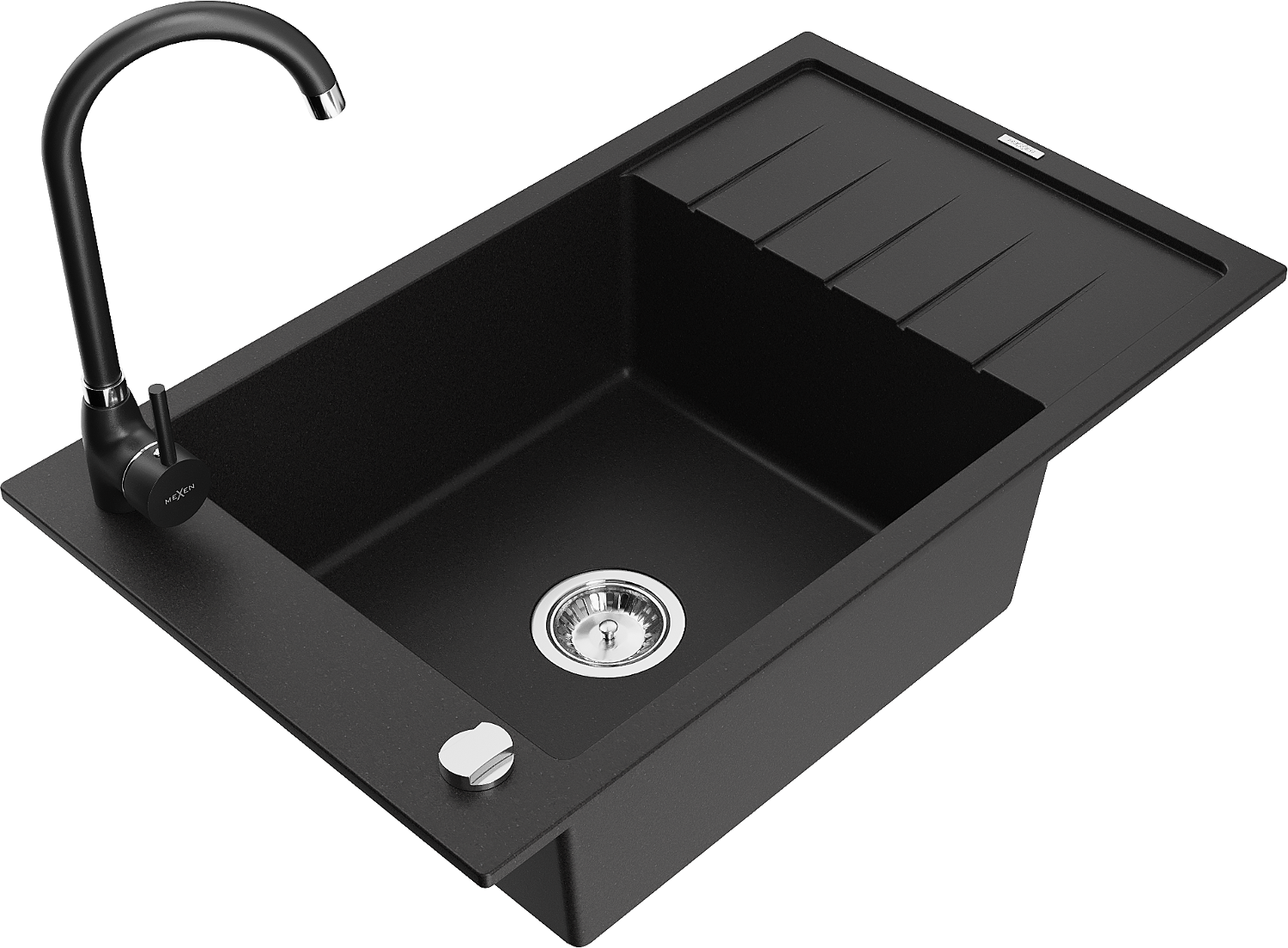 Mexen Elias chiuvetă de granit cu 1 compartiment, cu scurgător și baterie de bucătărie Telma, negru - 6511-77-670200-70