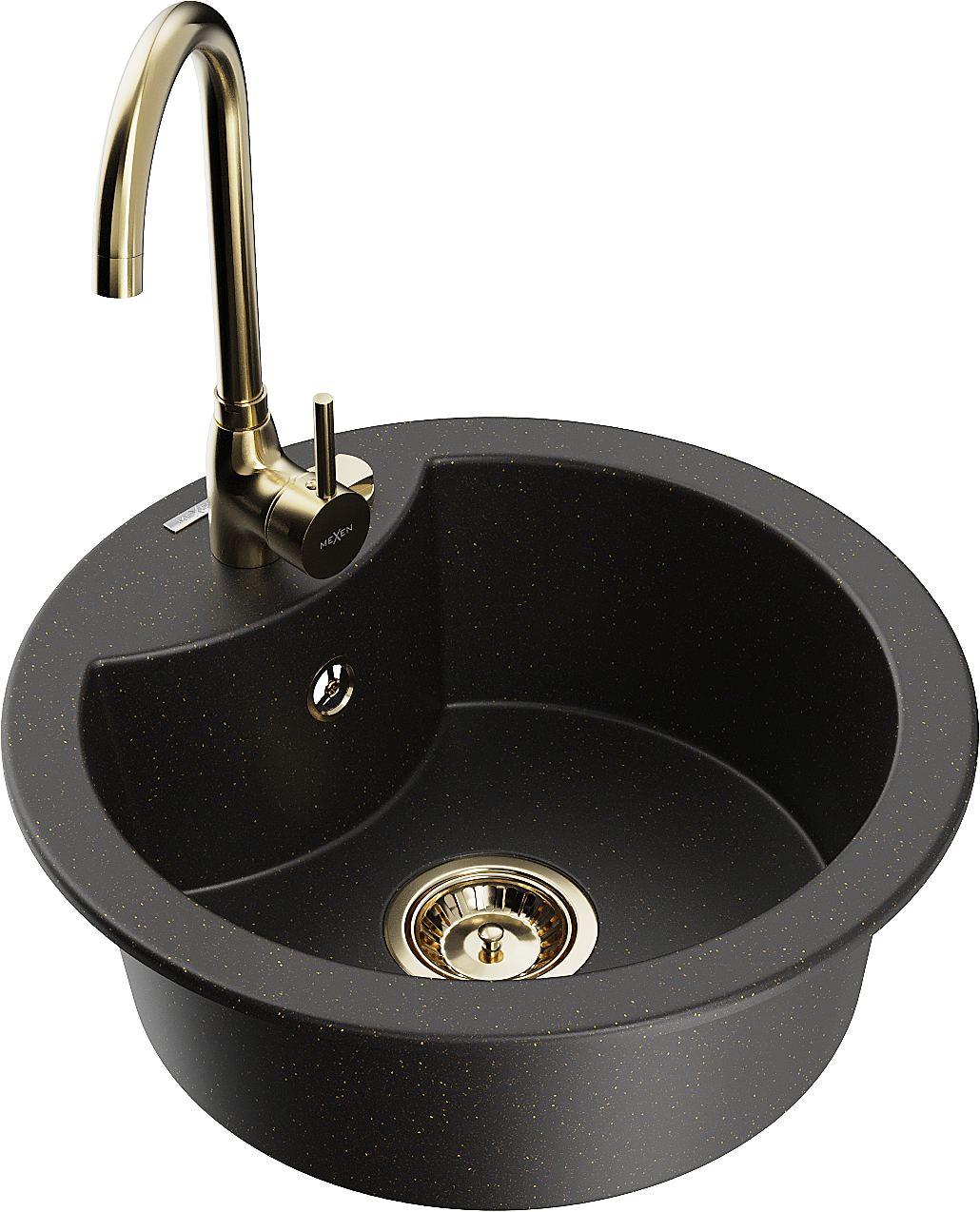 Mexen Diego chiuvetă de bucătărie din granit cu 1 compartiment și baterie de bucătărie Telma, negru/auriu - 6512-75-670200-50