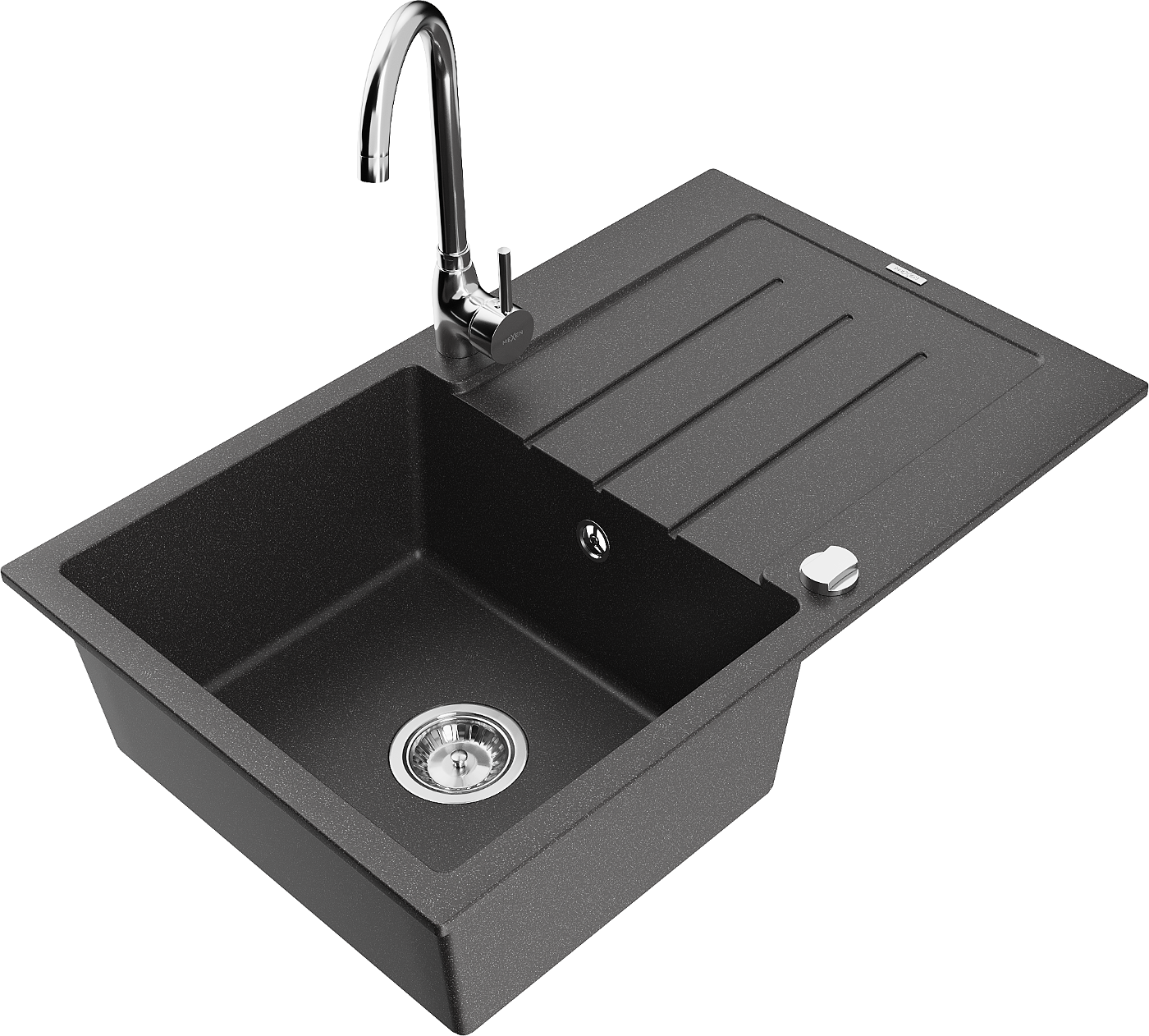 Chiuvetă granit Mexen Bruno 1-cameră cu scurgător și baterie de bucătărie Telma, negru înspicat - 6513-76-670200-00