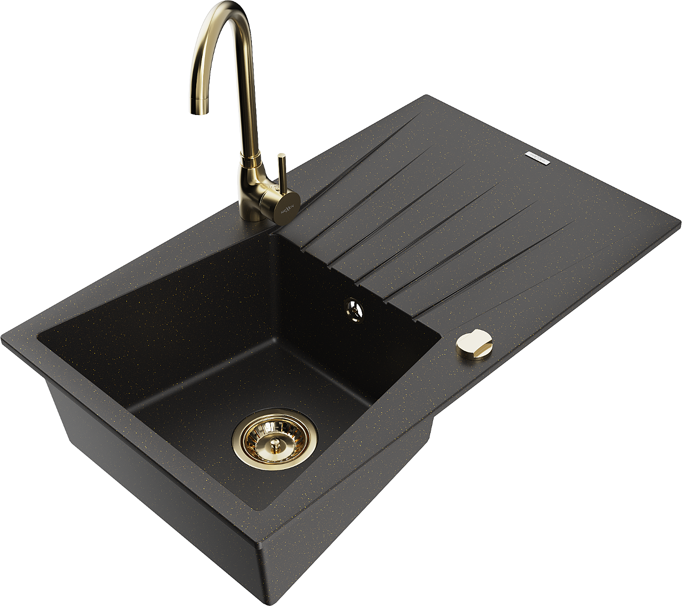 Mexen Cesar chiuvetă de granit cu 1 compartiment și scurgător și baterie de bucătărie Telma, negru/auriu - 6514-75-670200-50