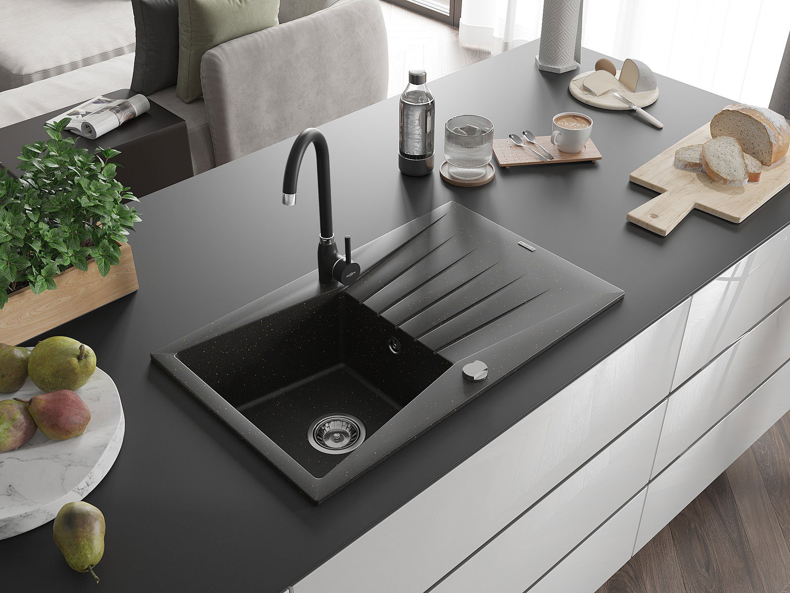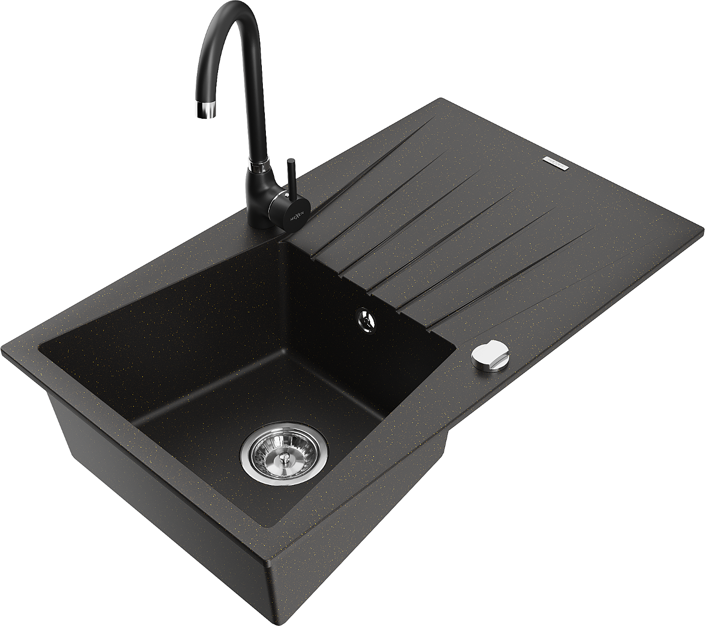 Mexen Cesar chiuvetă din granit cu 1 compartiment cu scurgător și baterie de bucătărie Telma, negru/auriu - 6514-75-670200-70