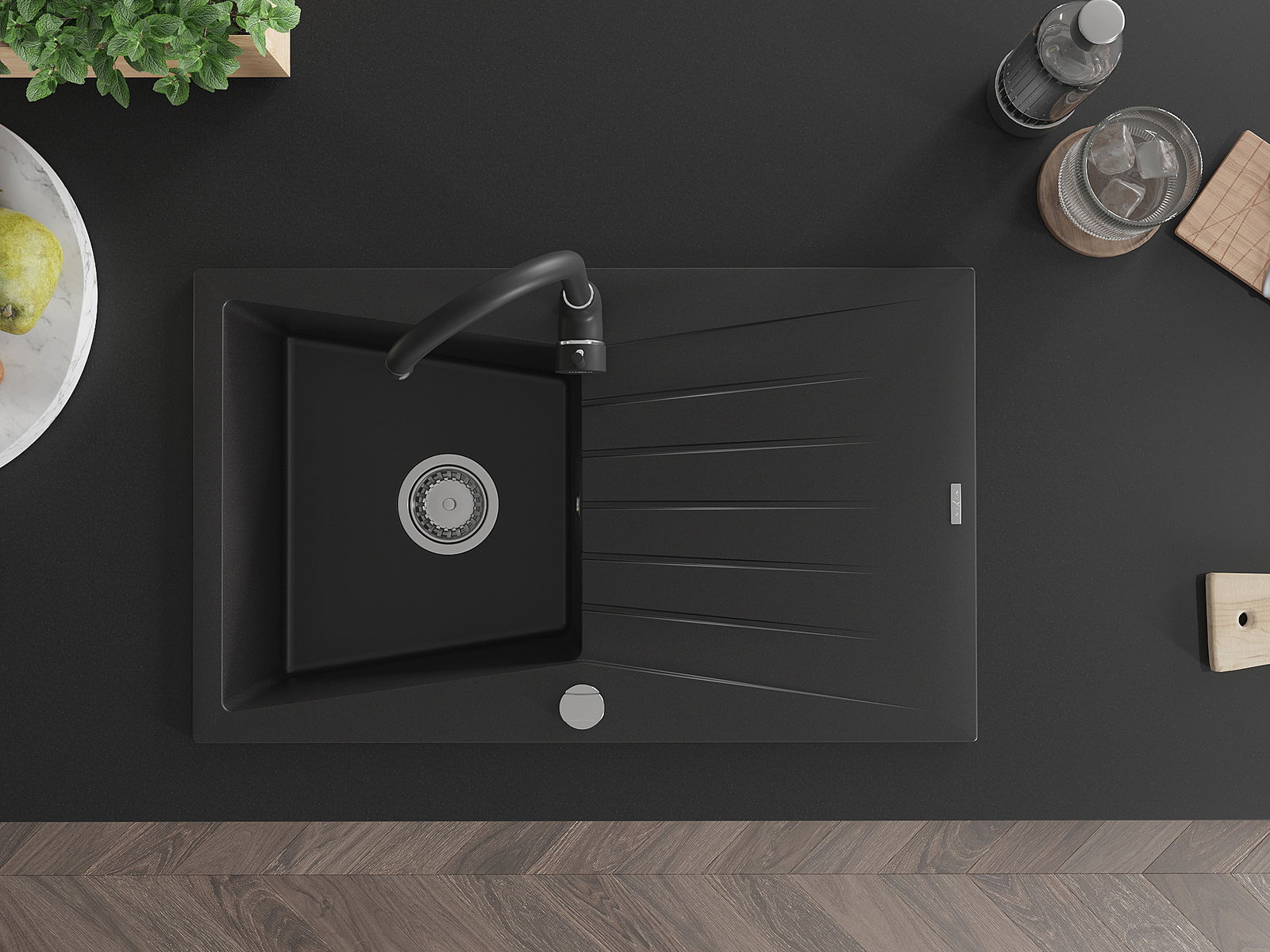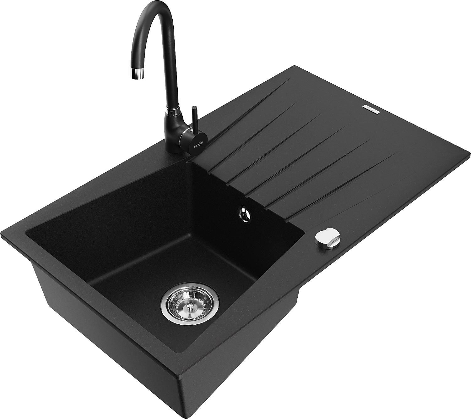 Mexen Cesar chiuvetă de bucătărie din granit cu 1 compartiment și scurgător și baterie Telma, negru - 6514-77-670200-70