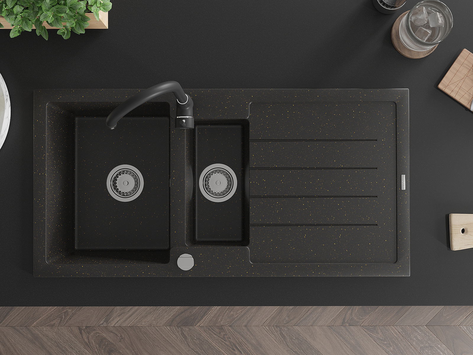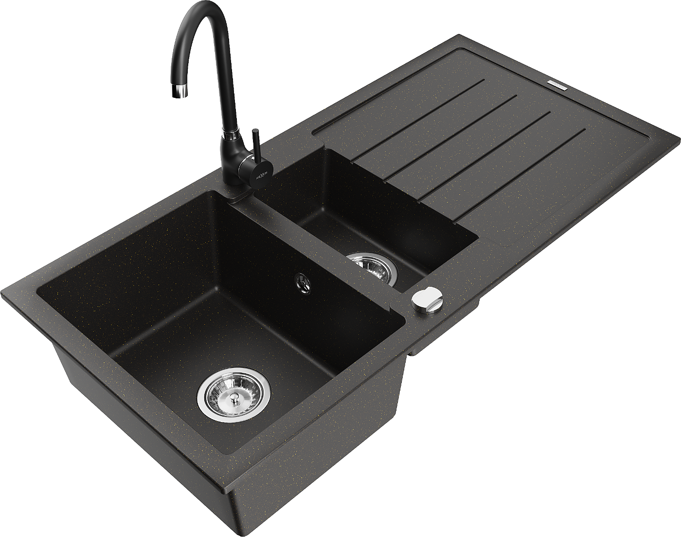 Mexen Andres chiuvetă de granit, cu 1,5 boluri, cu picurător și baterie de bucătărie Telma, negru/auriu - 6515-75-670200-70