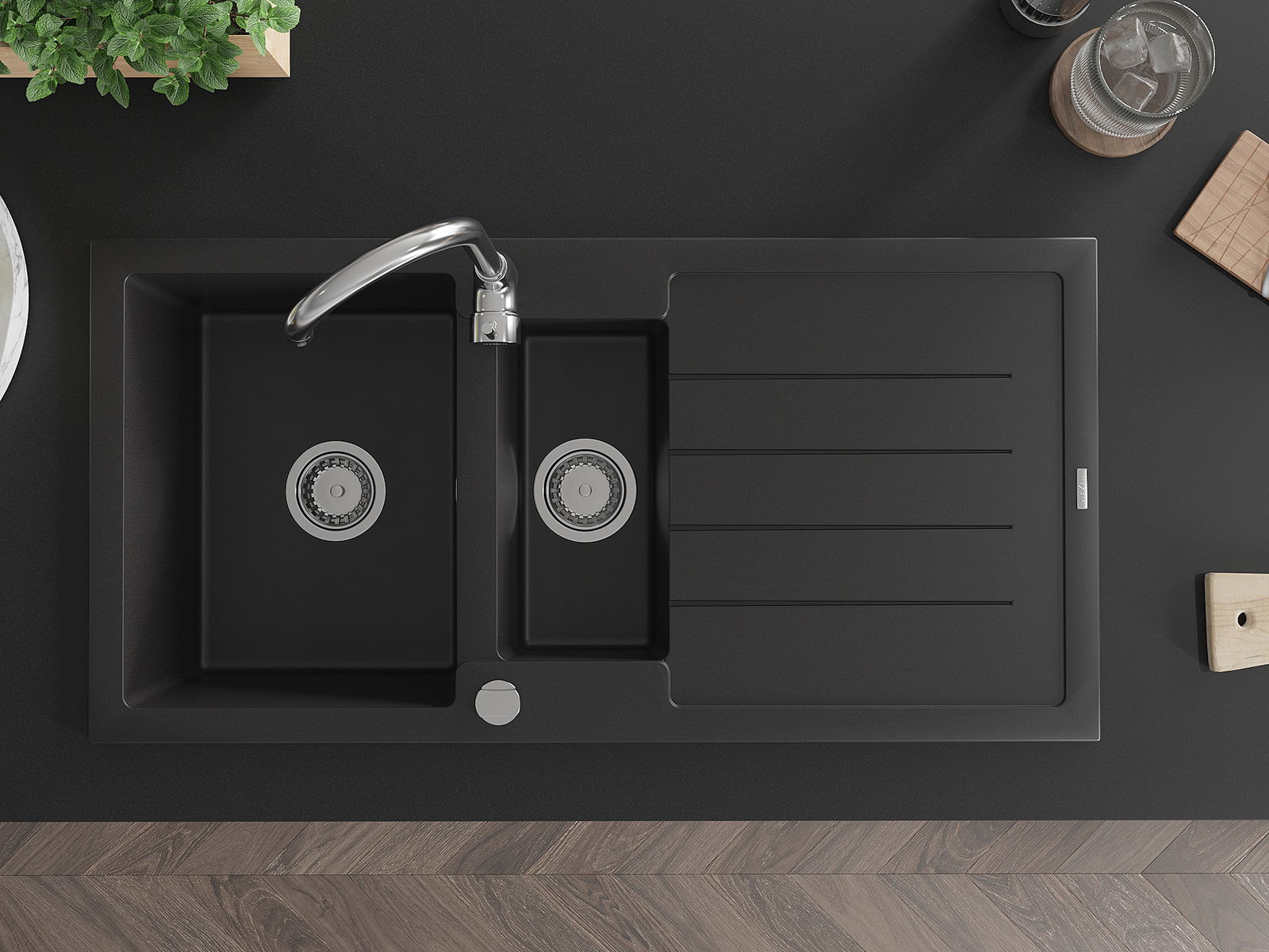 Mexen Andres chiuvetă de granit 1,5 compartimente cu picurător și baterie de bucătărie Telma, negru - 6515-77-670200-00