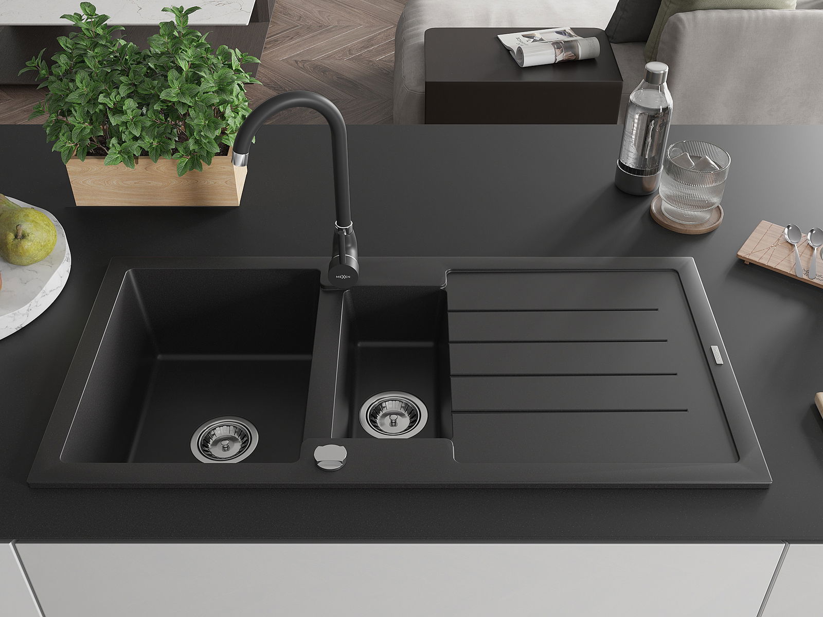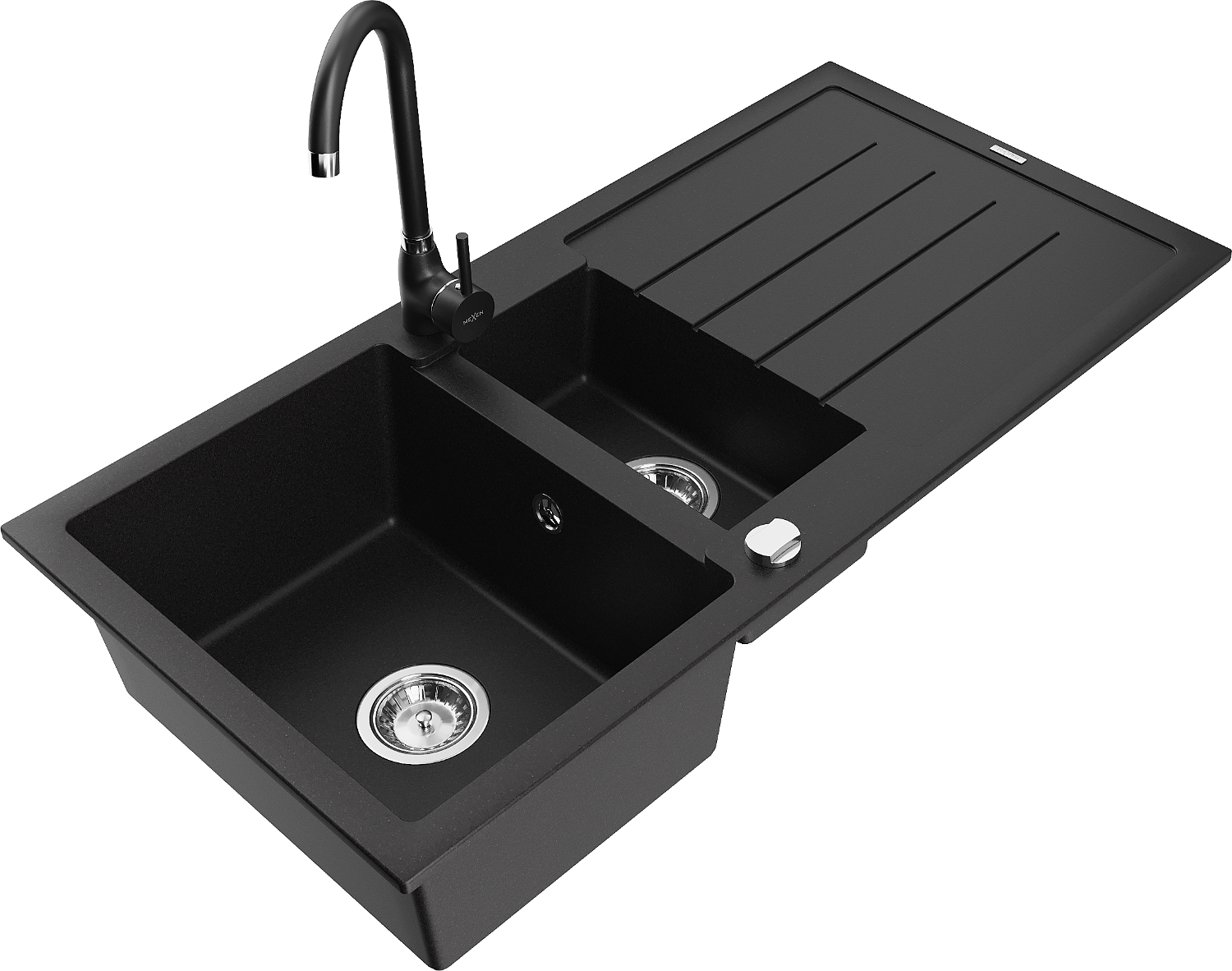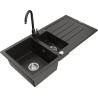Mexen Andres chiuvetă de granit cu 1,5 camere cu scurgător și baterie de bucătărie Telma, negru - 6515-77-670200-70