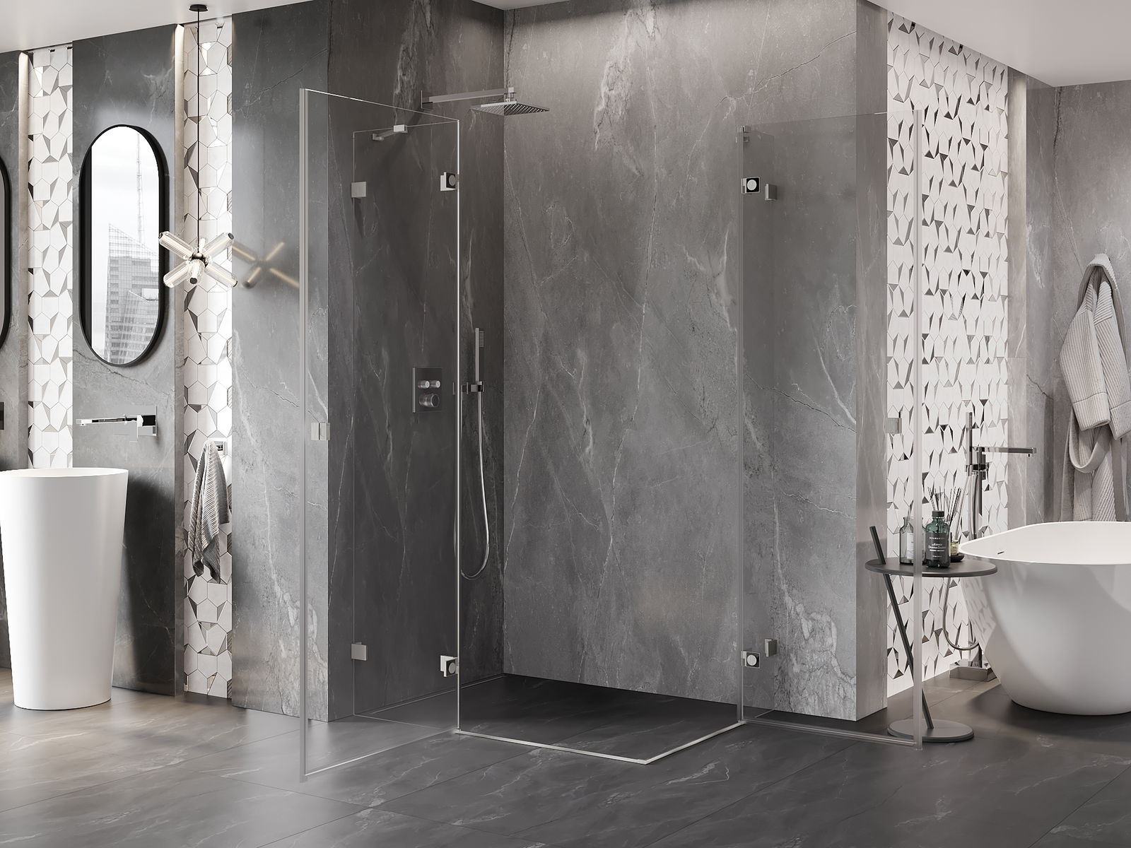Mânerul practic și confortabil este realizat din metal durabil și rezistent. Forma modernă, combinată cu un finisaj asortat cu culoarea profilelor, conferă un aspect modern și elegant întregului, subliniind estetica fiecărei băi.