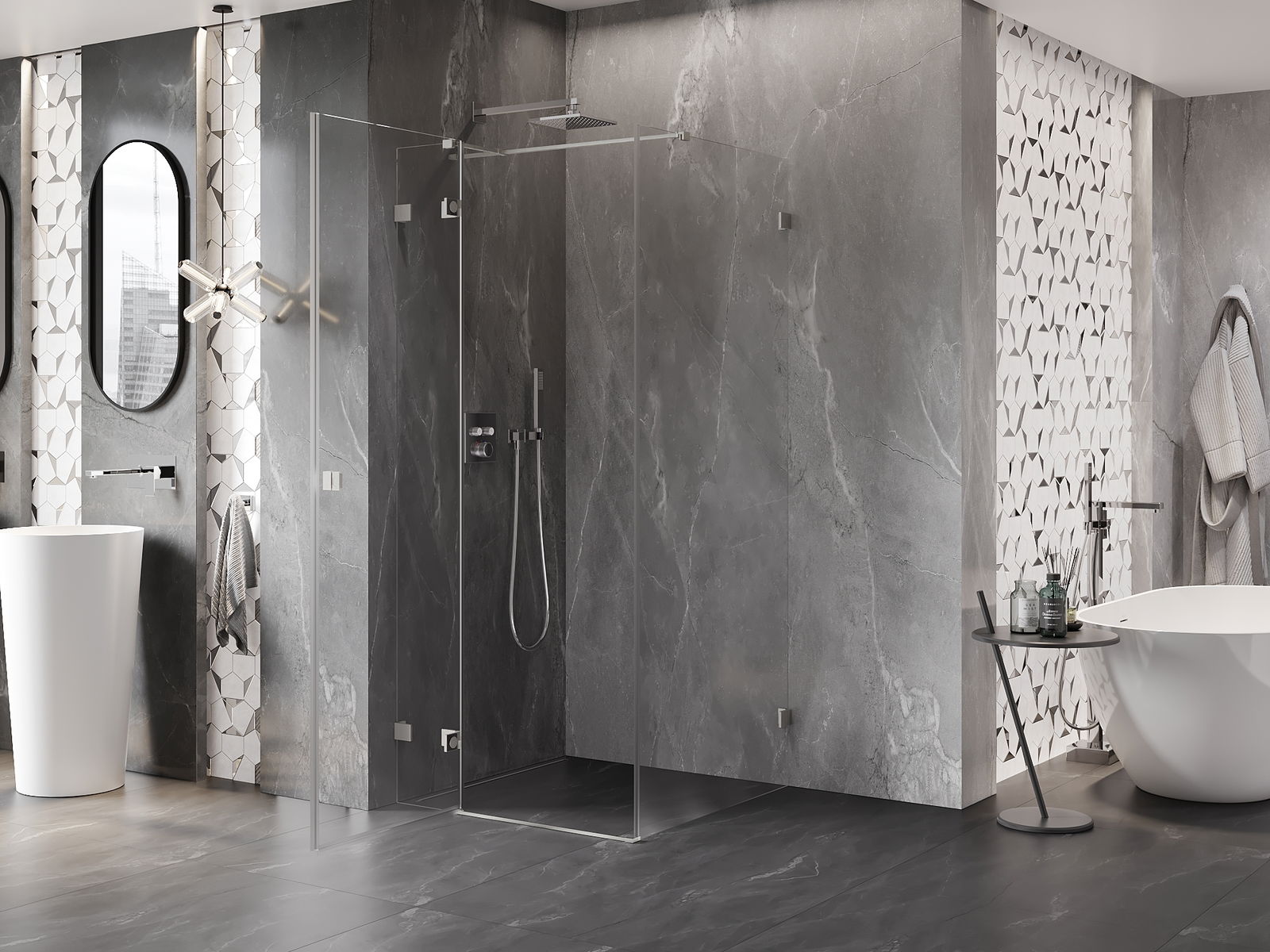 Mânerul practic și confortabil este realizat din metal durabil și rezistent. Forma modernă, combinată cu un finisaj asortat cu culoarea profilelor, conferă un aspect modern și elegant întregului, subliniind estetica fiecărei băi.