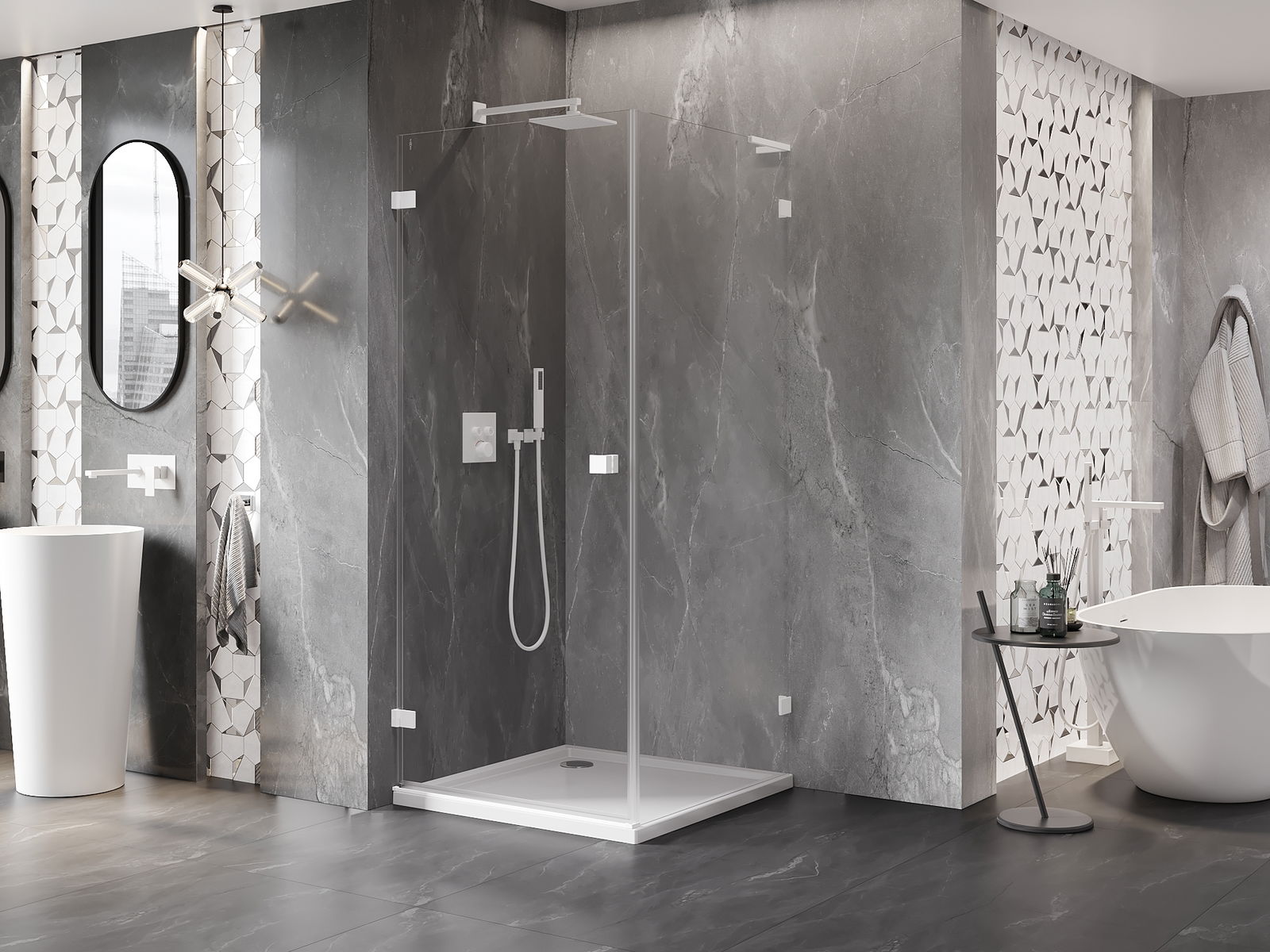 Mânerul practic și confortabil este realizat din metal durabil și rezistent. Forma modernă, combinată cu un finisaj asortat cu culoarea profilelor, conferă un aspect modern și elegant întregului, subliniind estetica fiecărei băi.