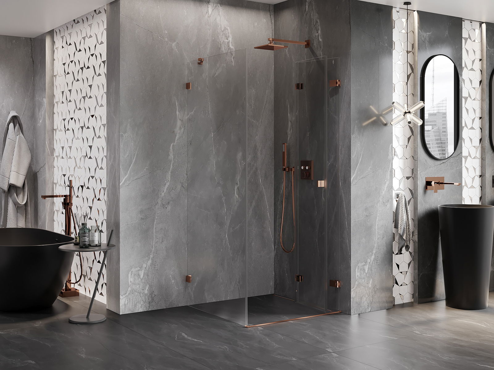 Mânerul practic și confortabil este realizat din metal durabil și rezistent. Forma modernă, combinată cu un finisaj asortat cu culoarea profilelor, conferă un aspect modern și elegant întregului, subliniind estetica fiecărei băi.