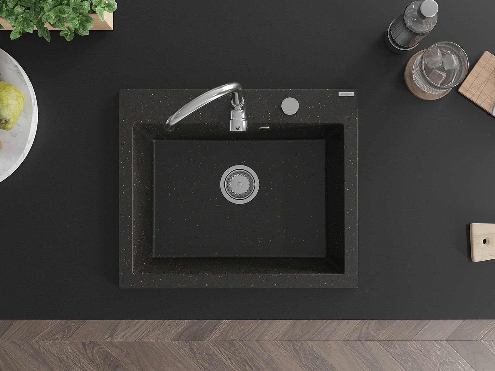 Mexen Elix chiuvetă de bucătărie din granit cu 1 compartiment 600 x 500 mm, negru/aur metalizat, sifon crom - 6525601005-75