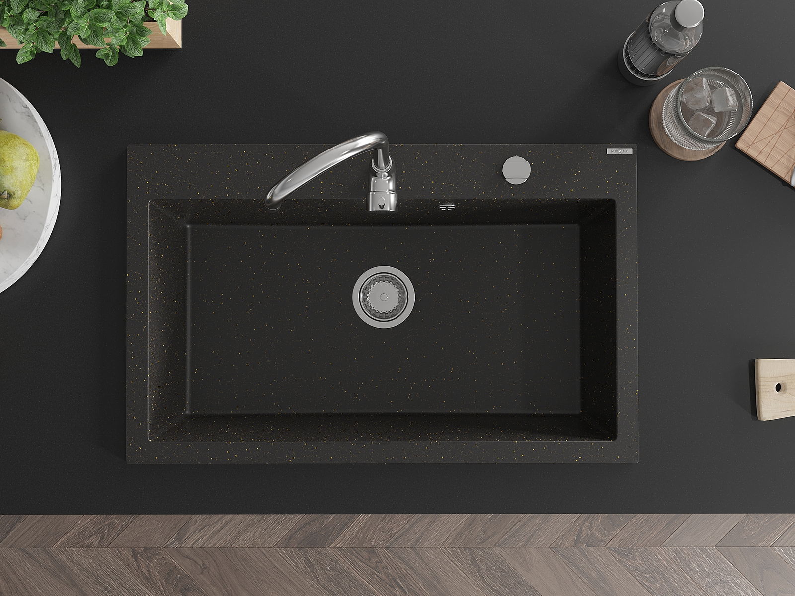 Mexen Elix chiuvetă de bucătărie din granit cu 1 compartiment 800 x 500 mm, negru/auriu metalic, sifon crom - 6527801005-75