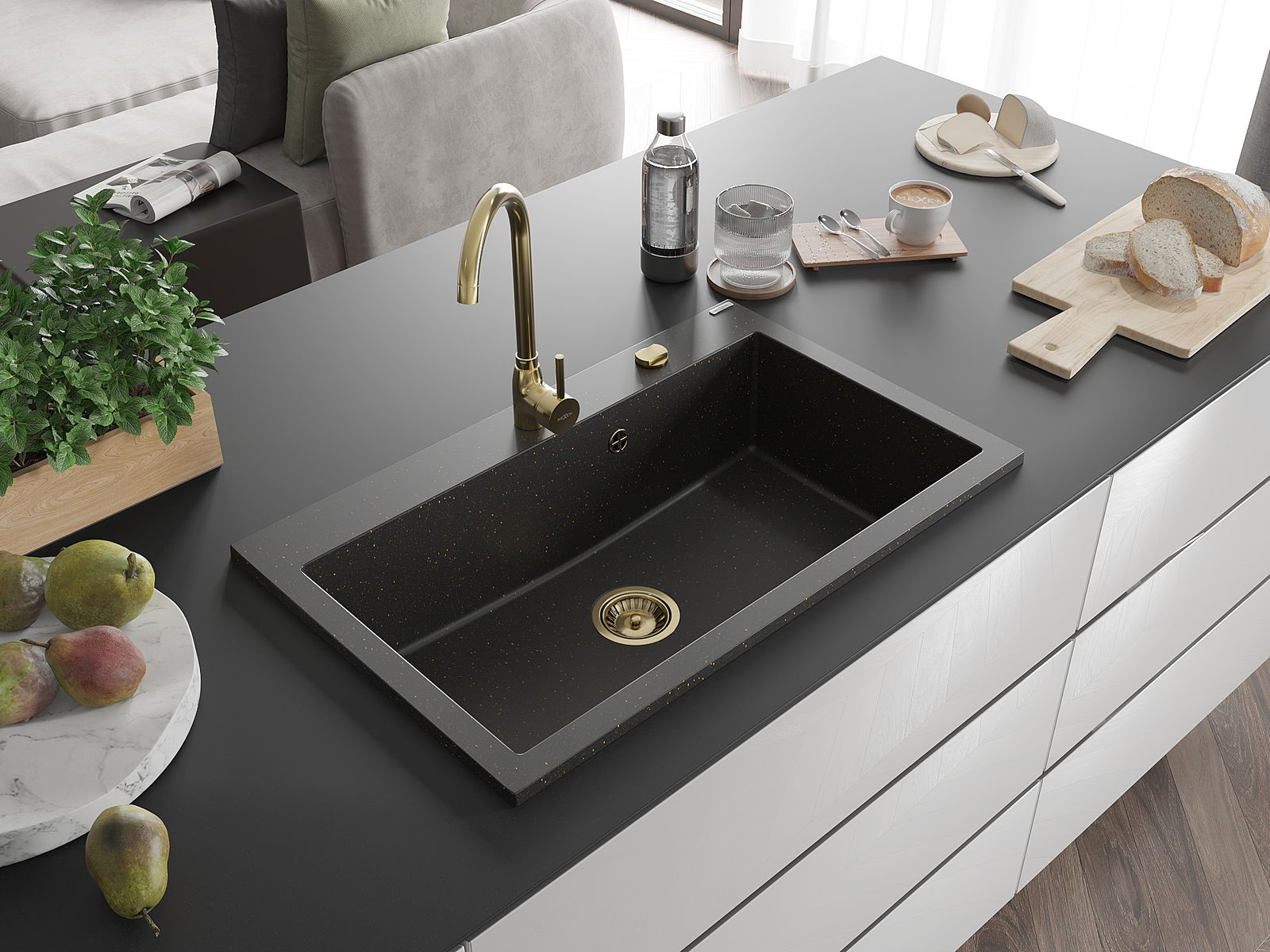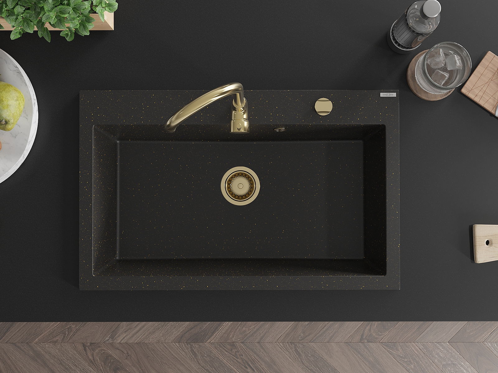 Mexen Elix chiuvetă de bucătărie din granit cu 1 compartiment 800 x 500 mm, negru/auriu metalic, sifon auriu - 6527801005-75-G