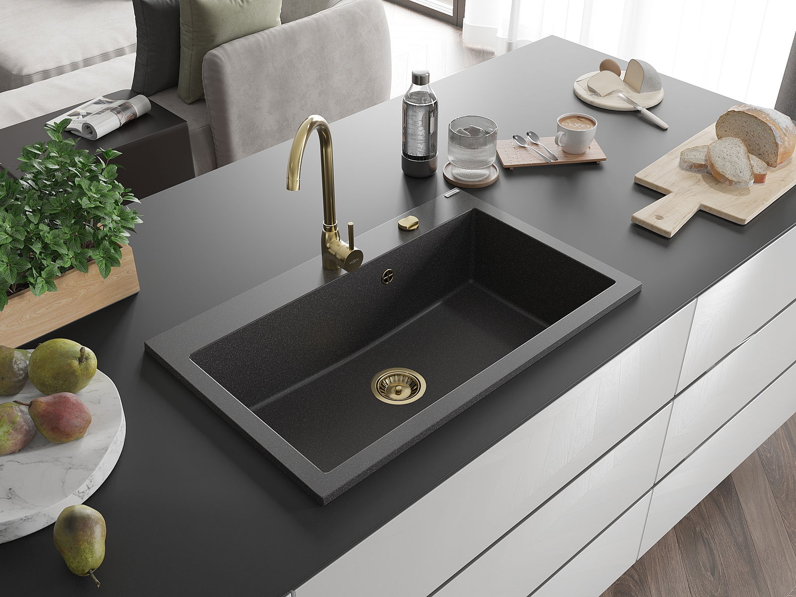 Mexen Elix chiuvetă de granit, 1 cuvă, 800 x 500 mm, negru pătat, sifon auriu - 6527801005-76-G