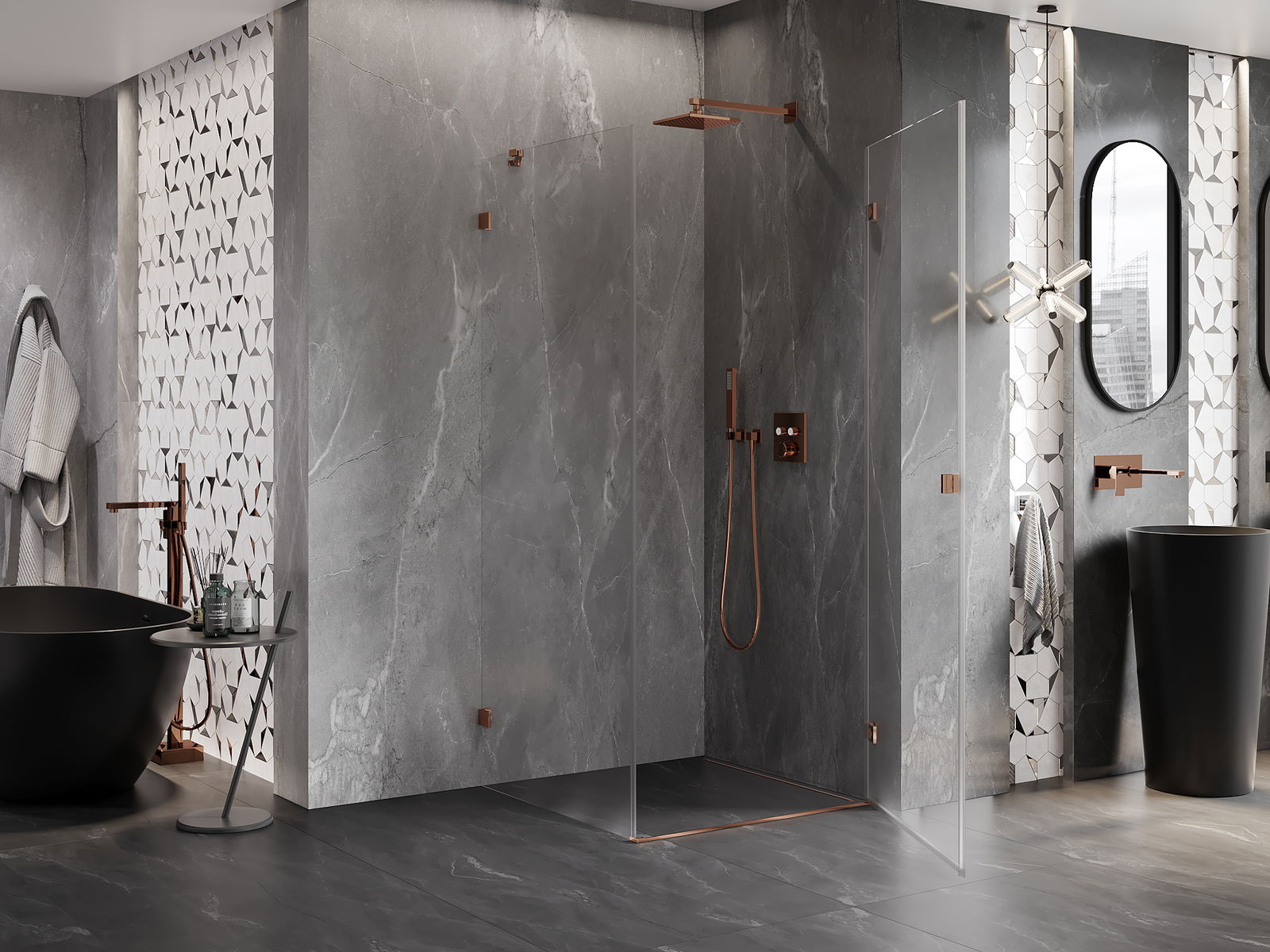 Clemele au fost realizate din alamă foarte durabilă și, în plus, creează o suprafață de sticlă nivelată. Este o alegere excelentă care combină eleganța, durabilitatea și designul modern. Datorită acestor soluții, dușul câștigă în estetică și, în același timp, facilitează menținerea curățeniei.