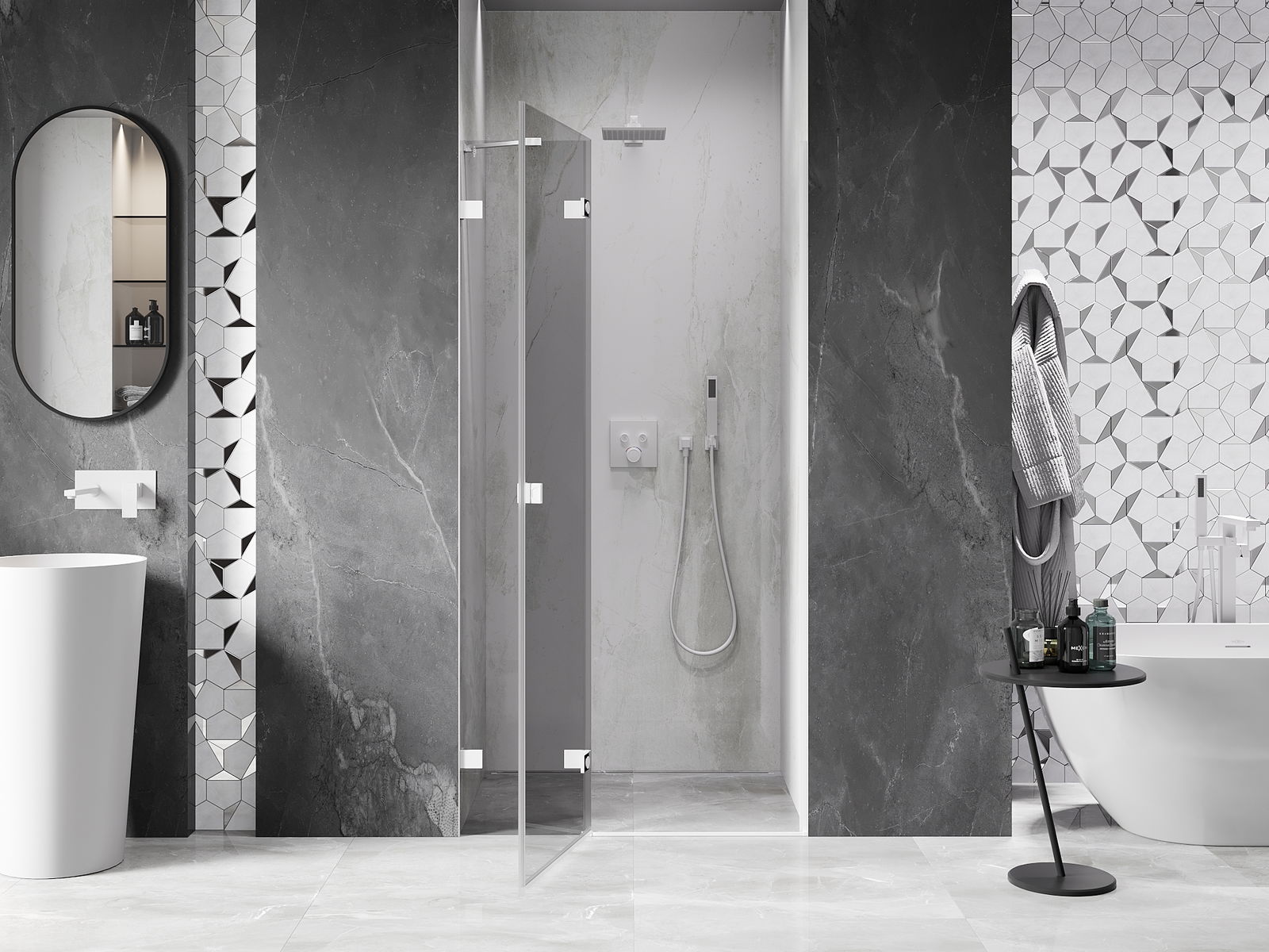 Mânerul practic și confortabil este realizat din metal durabil și rezistent. Forma modernă, combinată cu un finisaj asortat cu culoarea profilelor, conferă un aspect modern și elegant întregului, subliniind estetica fiecărei băi.