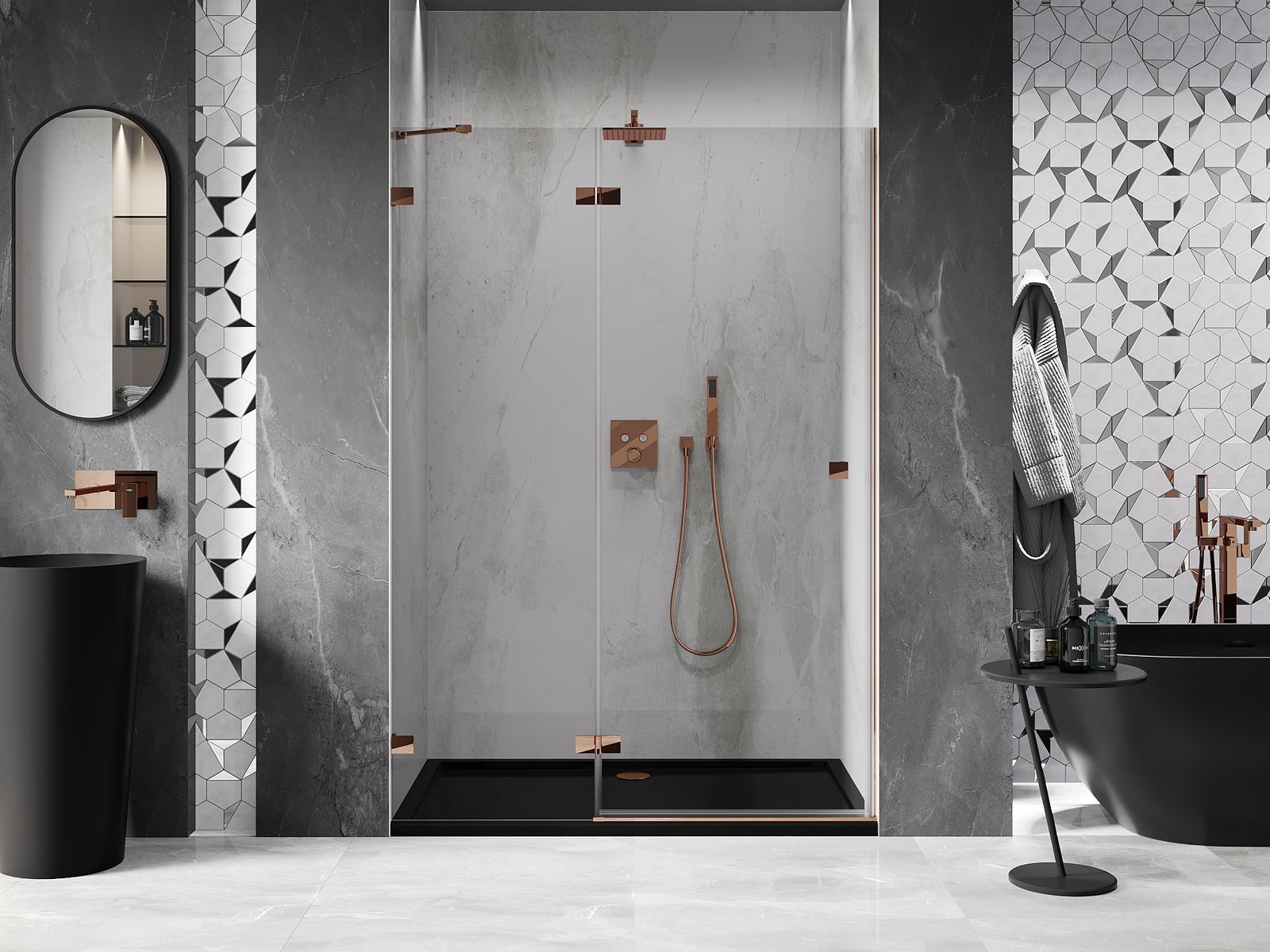 Clemele și balamalele sunt fabricate din alamă foarte durabilă și, în plus, formează o suprafață aliniată cu sticla. Este o alegere excelentă care îmbină eleganța, durabilitatea și designul modern. Datorită acestor soluții, dușul câștigă în estetică și facilitează întreținerea curățeniei.