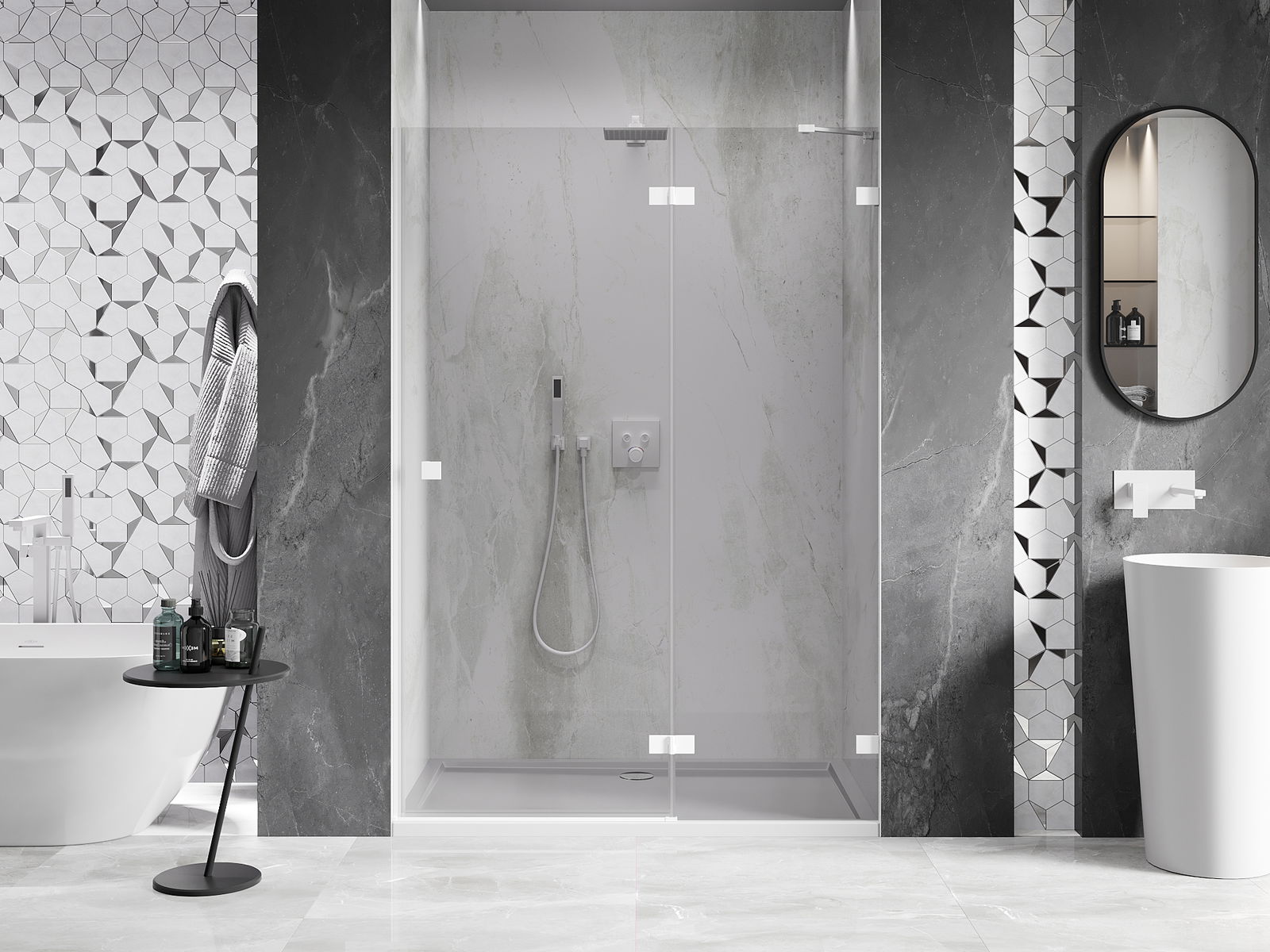 Produsul poate fi montat fie pe cabina de duș, fie direct pe podea, în funcție de nevoi. Metoda de montare universală permite adaptarea produsului la diferite tipuri de băi și configurații de spațiu.