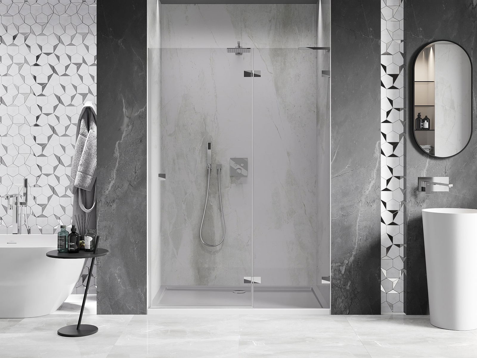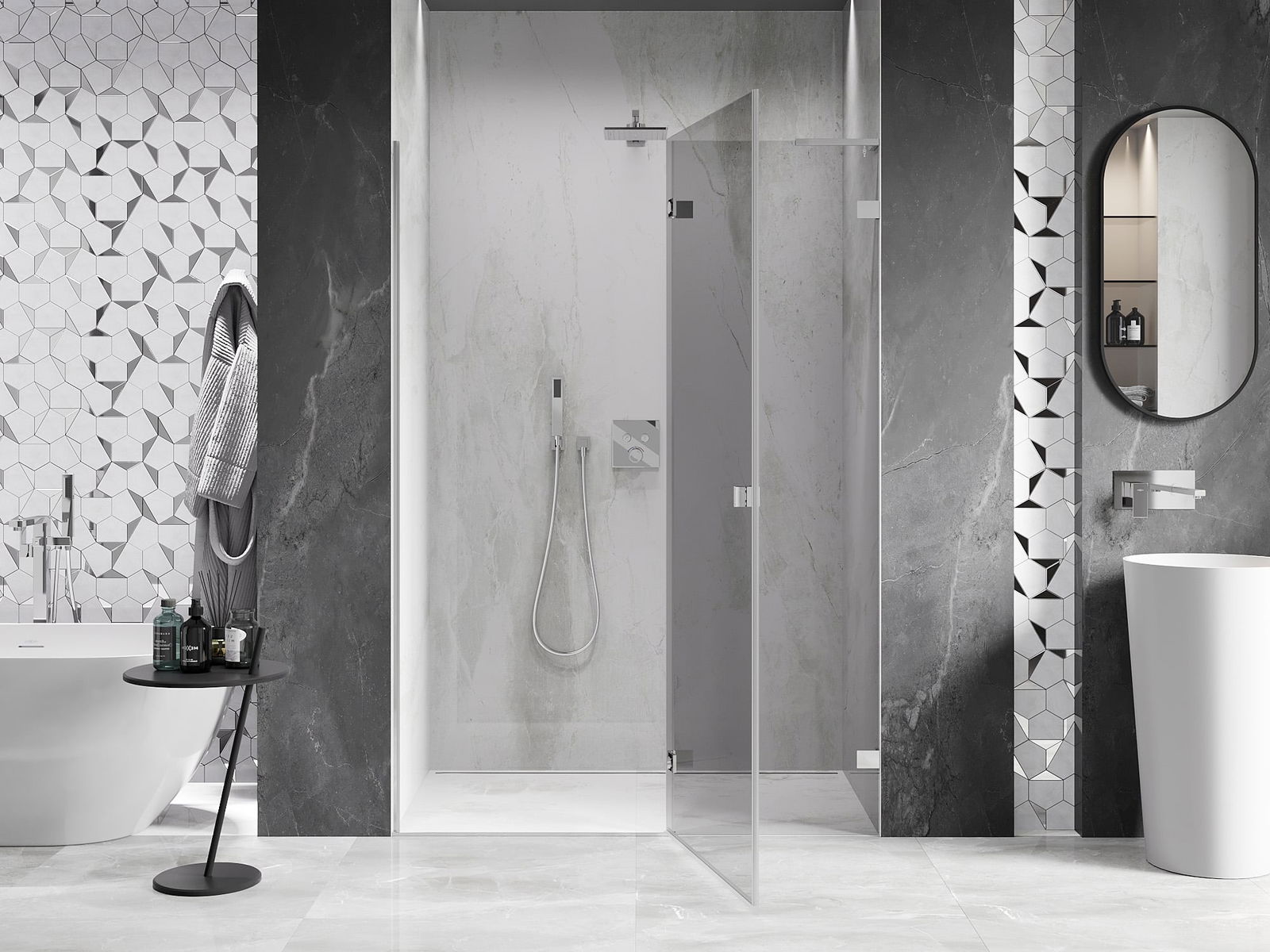 Mânerul practic și confortabil este realizat din metal durabil și rezistent. Forma modernă, combinată cu un finisaj asortat cu culoarea profilelor, conferă un aspect modern și elegant întregului, subliniind estetica fiecărei băi.