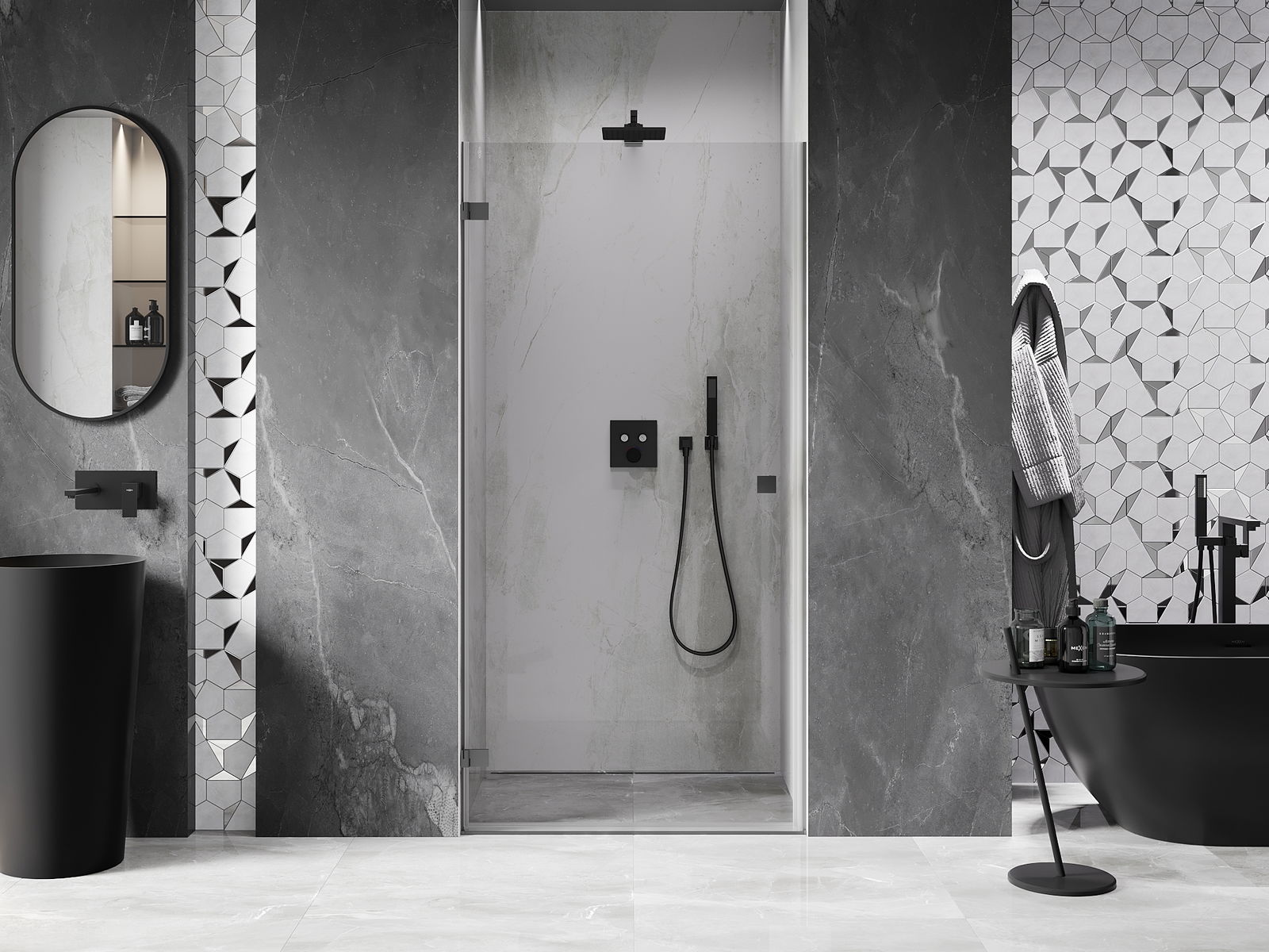 Mânerul practic și confortabil este realizat din metal durabil și rezistent. Forma modernă, combinată cu un finisaj asortat cu culoarea profilelor, conferă un aspect modern și elegant întregului, subliniind estetica fiecărei băi.