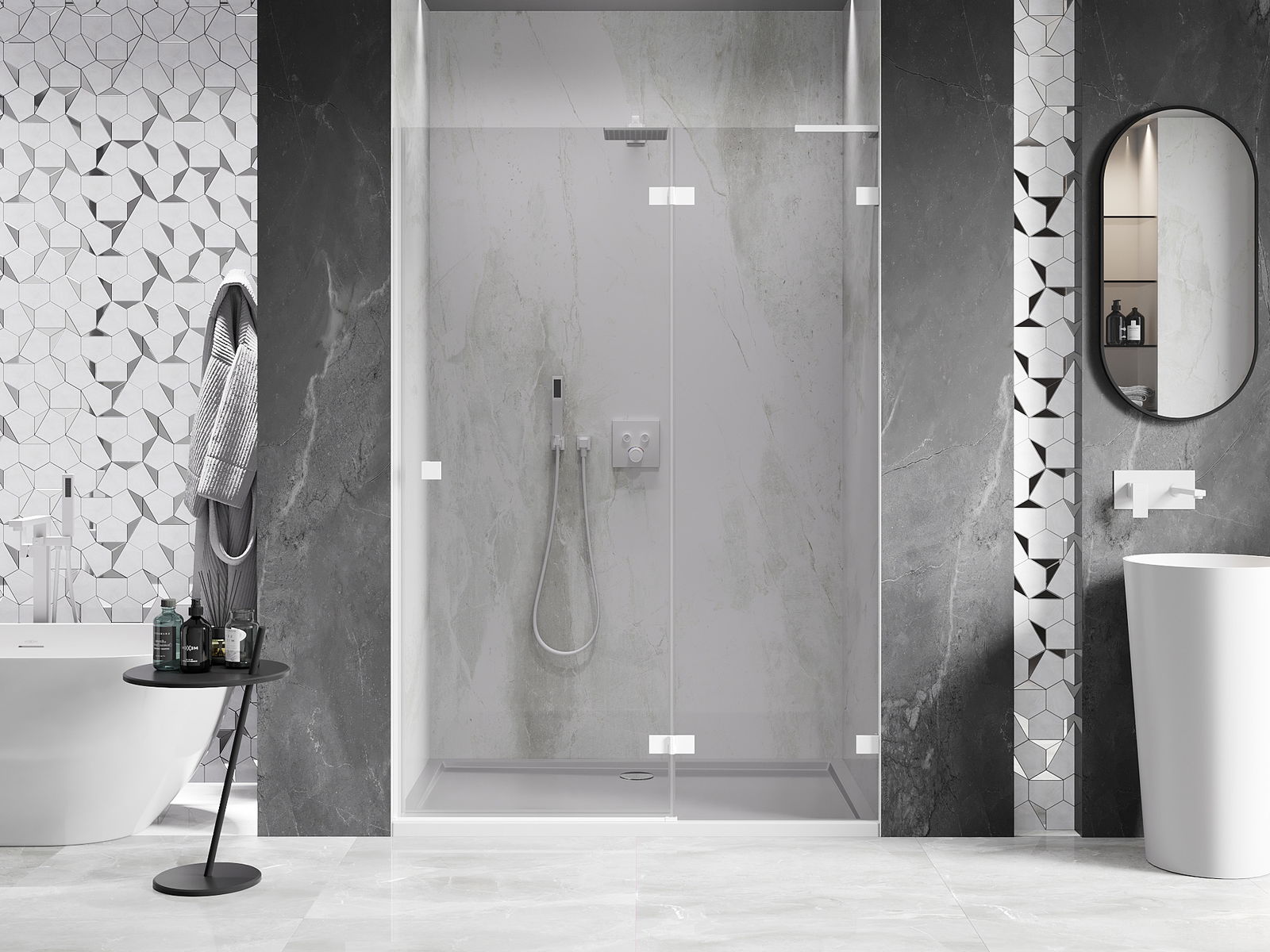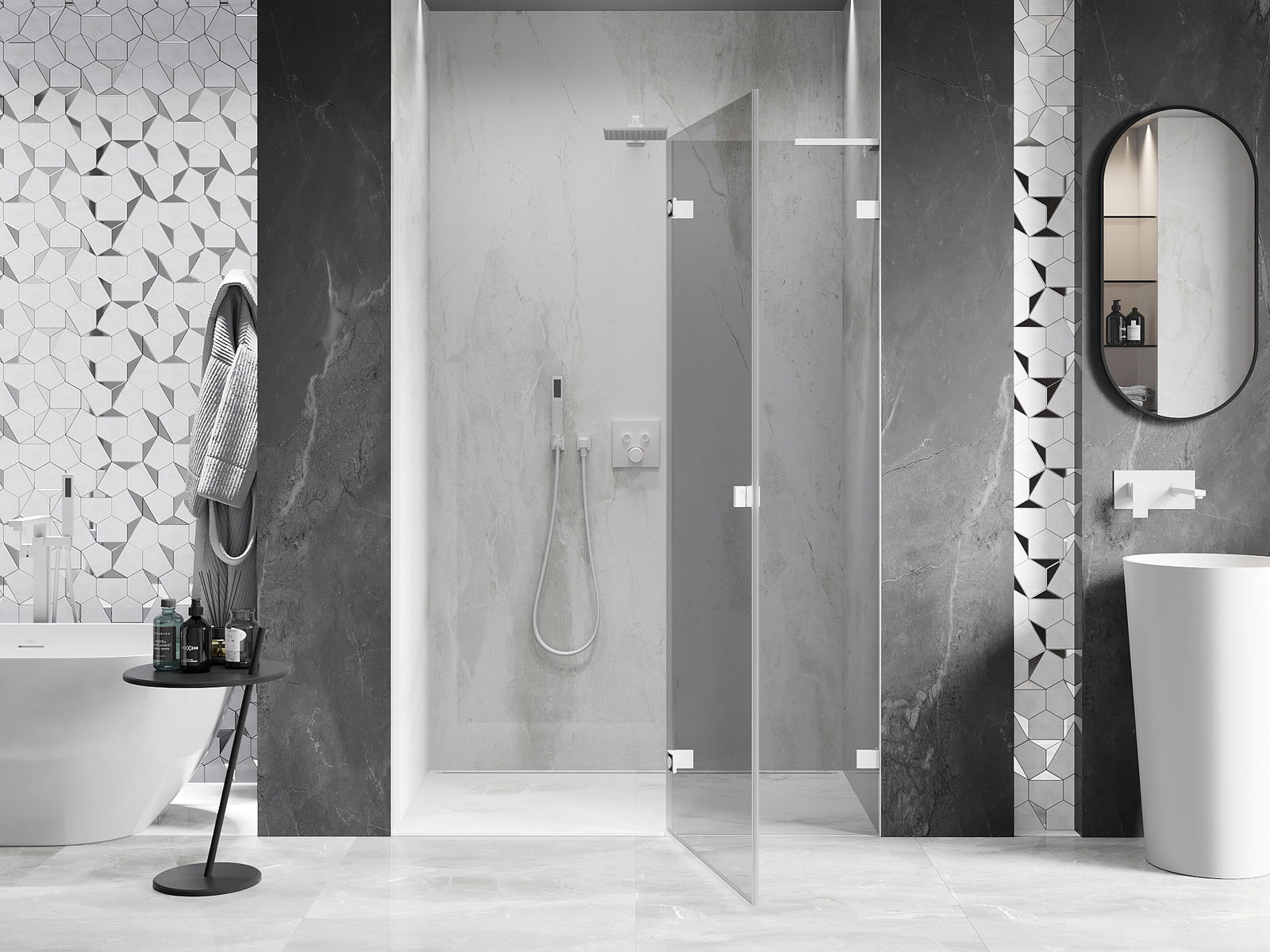 Mânerul practic și confortabil este realizat din metal durabil și rezistent. Forma modernă, combinată cu un finisaj asortat cu culoarea profilelor, conferă un aspect modern și elegant întregului, subliniind estetica fiecărei băi.