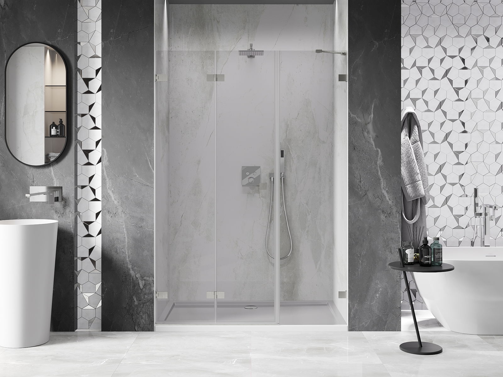 Posibilitatea de a plia ușile, atât către exterior, cât și către interior, permite obținerea mai mult spațiu atunci când nu se folosește dușul. Este o soluție ideală pentru băi mai mici, maximizând utilizarea spațiului disponibil.