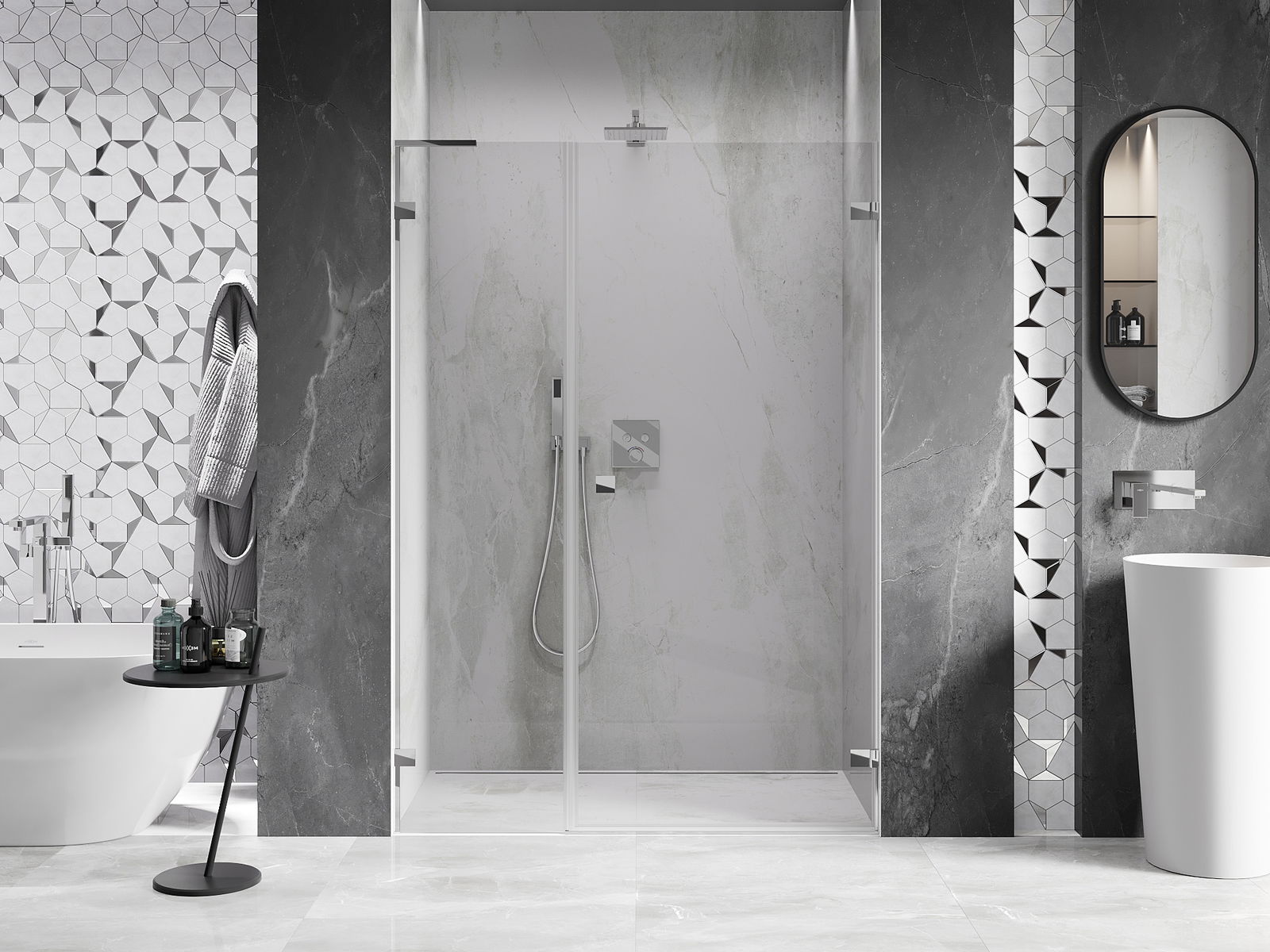 Clemele au fost realizate din alamă foarte durabilă și, în plus, creează o suprafață de sticlă nivelată. Este o alegere excelentă care combină eleganța, durabilitatea și designul modern. Datorită acestor soluții, dușul câștigă în estetică și, în același timp, facilitează menținerea curățeniei.