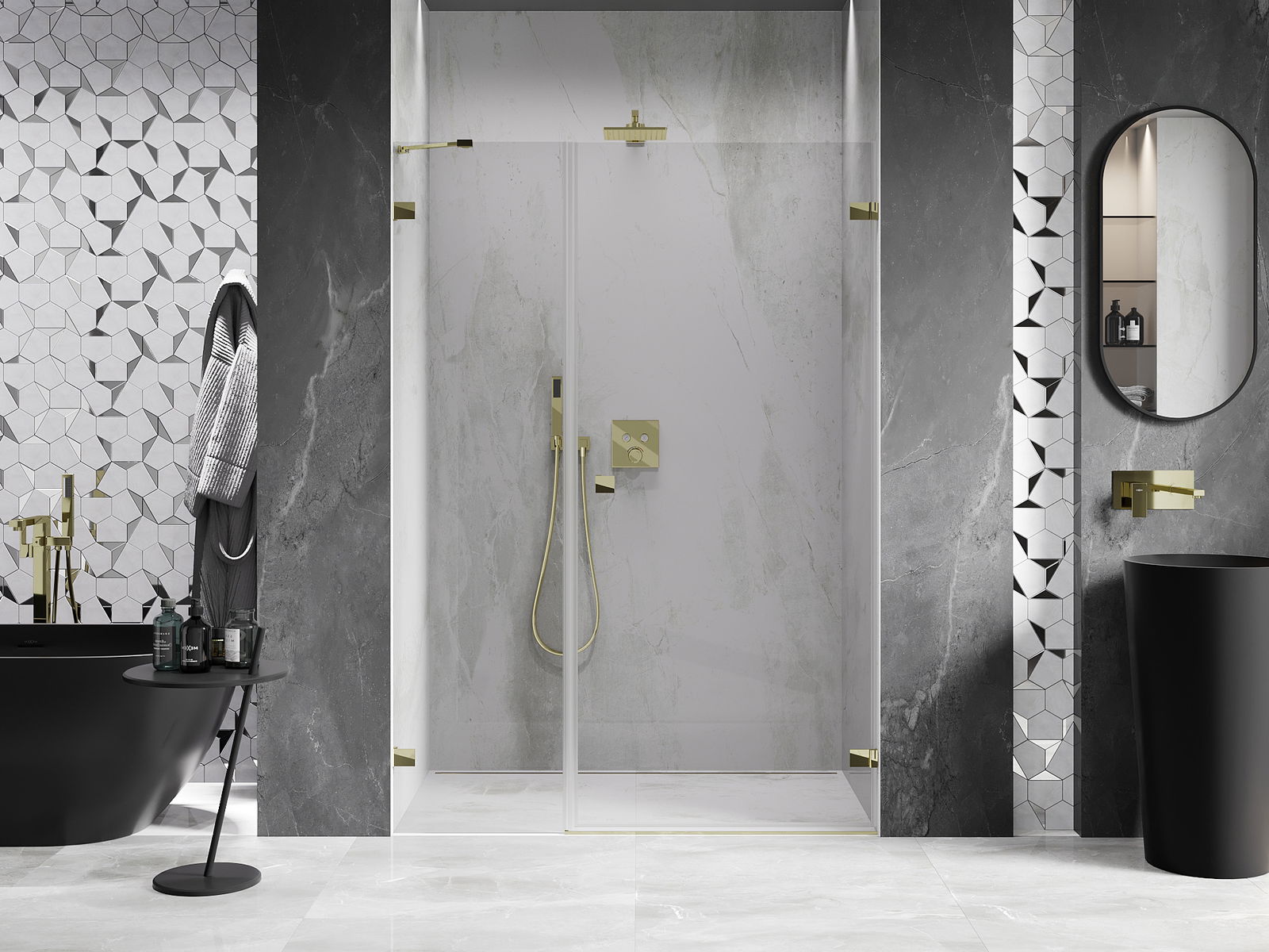 Clemele au fost realizate din alamă foarte durabilă și, în plus, creează o suprafață de sticlă nivelată. Este o alegere excelentă care combină eleganța, durabilitatea și designul modern. Datorită acestor soluții, dușul câștigă în estetică și, în același timp, facilitează menținerea curățeniei.
