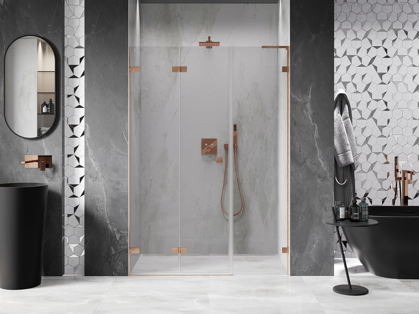 Clemele și balamalele sunt fabricate din alamă foarte durabilă și, în plus, formează o suprafață aliniată cu sticla. Este o alegere excelentă care îmbină eleganța, durabilitatea și designul modern. Datorită acestor soluții, dușul câștigă în estetică și facilitează întreținerea curățeniei.