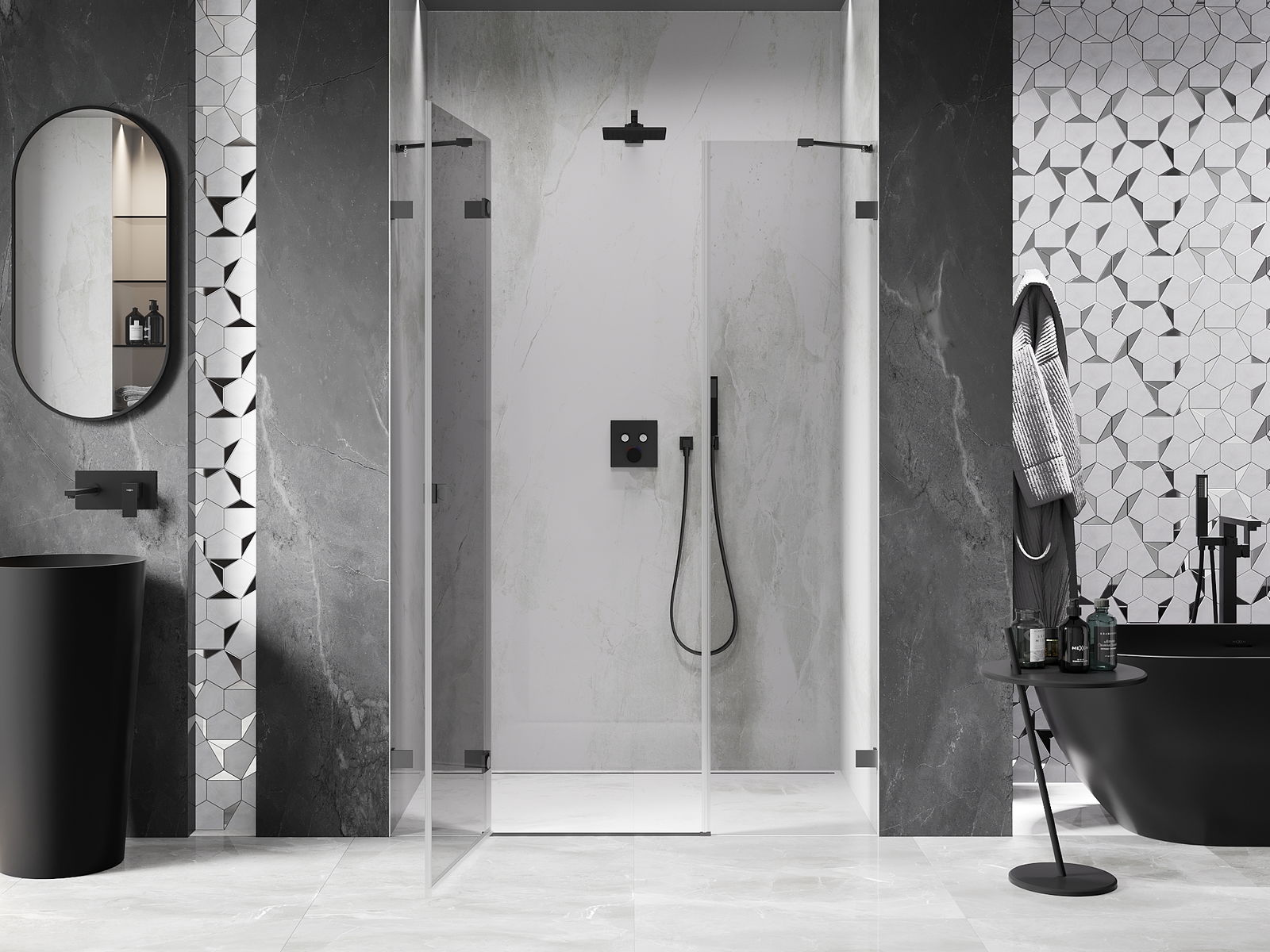 Mânerul practic și confortabil este realizat din metal durabil și rezistent. Forma modernă, combinată cu un finisaj asortat cu culoarea profilelor, conferă un aspect modern și elegant întregului, subliniind estetica fiecărei băi.