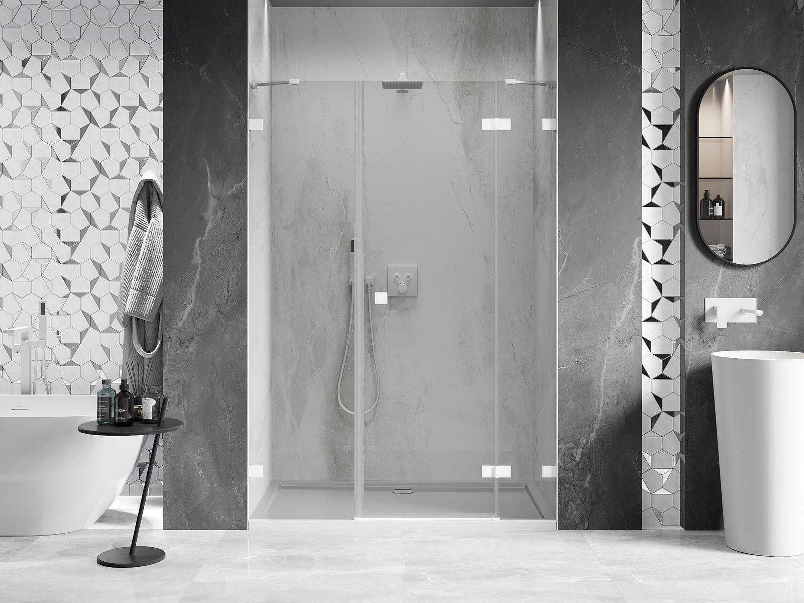 Mânerul practic și confortabil este realizat din metal durabil și rezistent. Forma modernă, combinată cu un finisaj asortat cu culoarea profilelor, conferă un aspect modern și elegant întregului, subliniind estetica fiecărei băi.