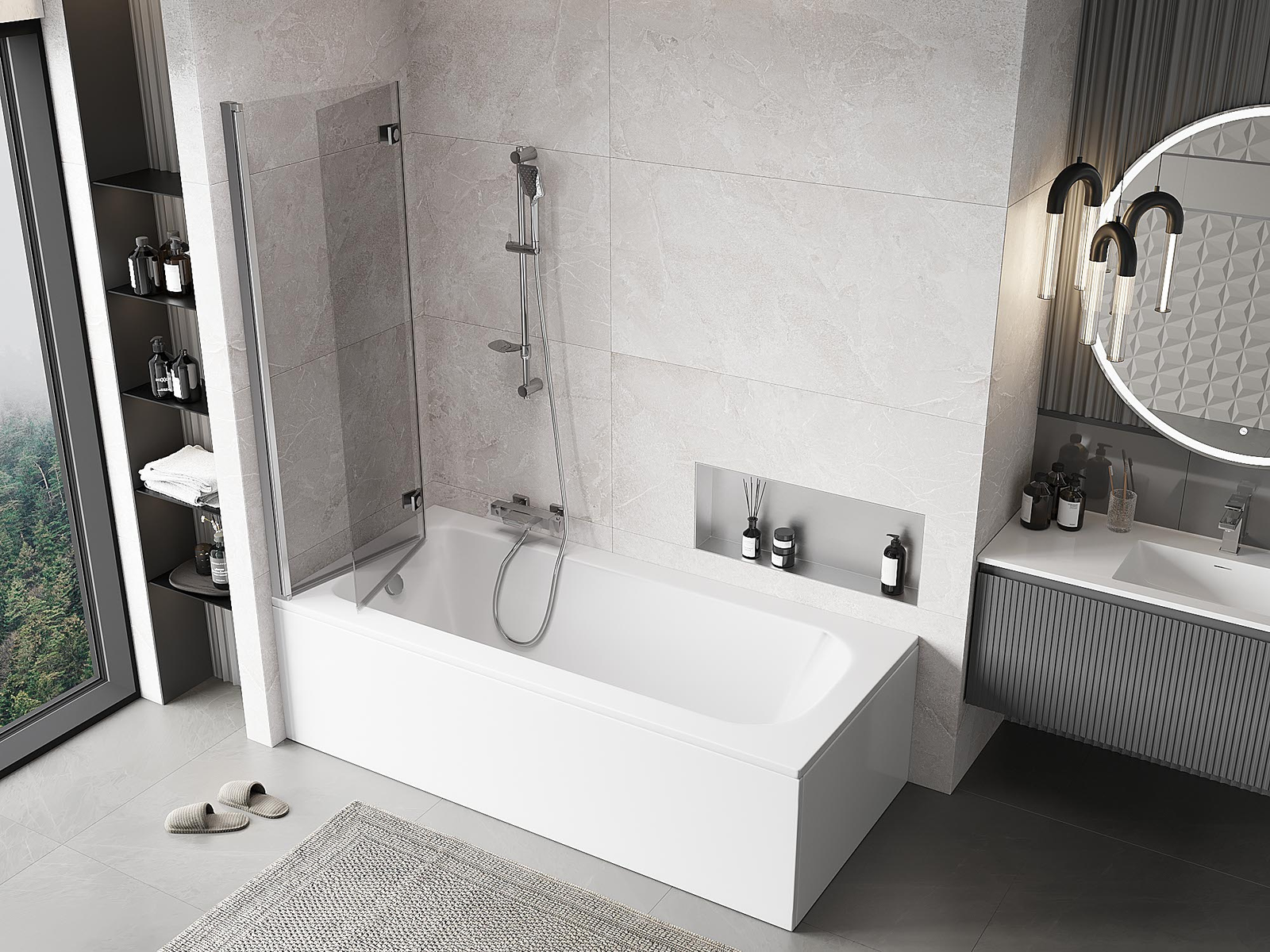 O protecție eficientă împotriva vărsării apei în timpul băii. Paravanul are garnituri care se potrivesc perfect cu suprafața de sticlă și marginea căzii. O soluție funcțională care asigură siguranță și întreținere ușoară a curățeniei.