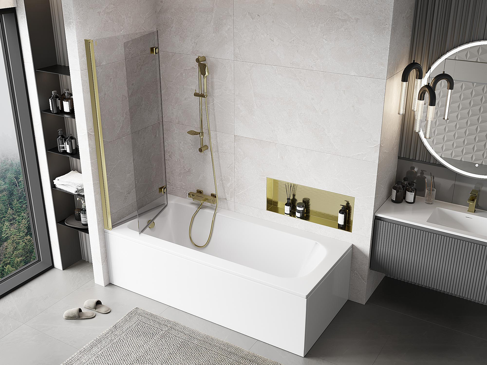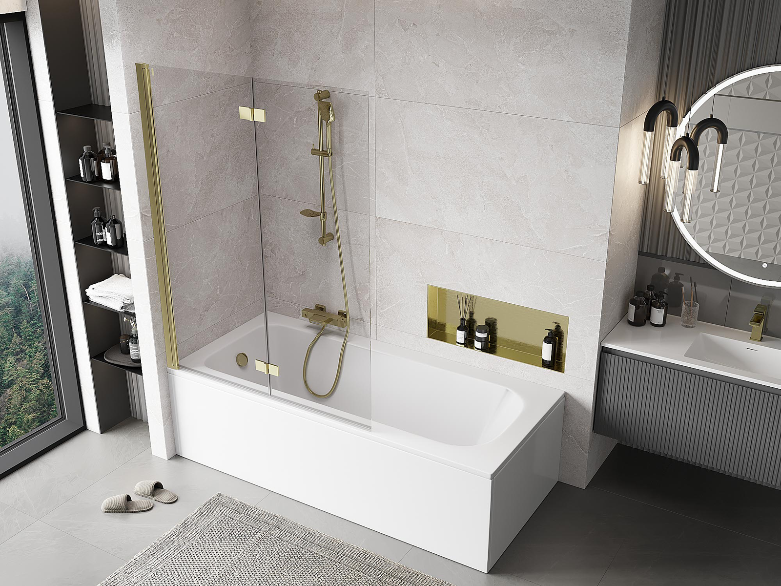 Paravan realizat din două uși cu posibilitatea de pliere. Această soluție permite economisirea mai mult spațiu în baie și permite utilizarea liberă a spațiului rămas atunci când nu folosim zona de baie.