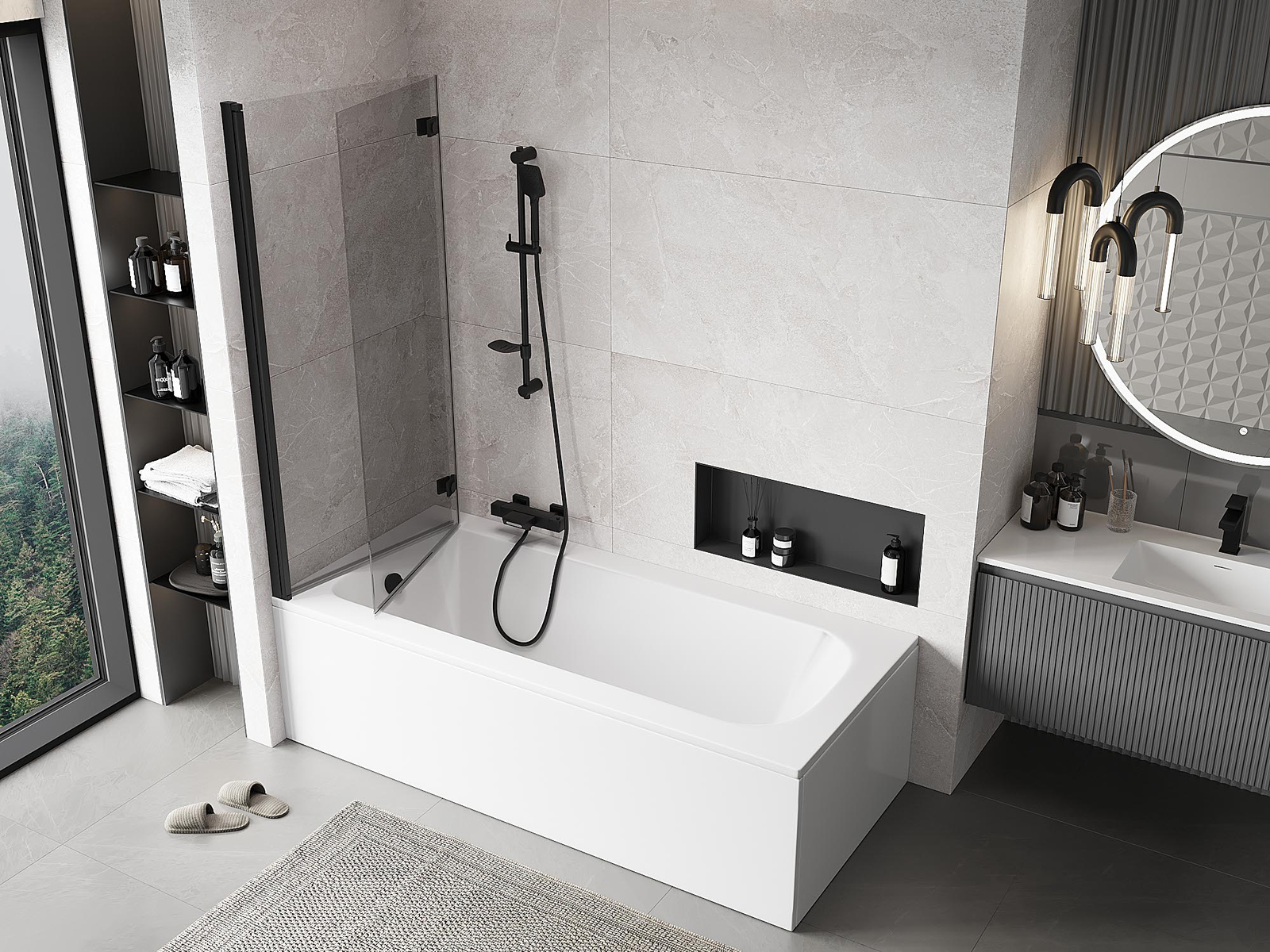Paravan realizat din două uși cu posibilitatea de pliere. Această soluție permite economisirea mai mult spațiu în baie și permite utilizarea liberă a spațiului rămas atunci când nu folosim zona de baie.