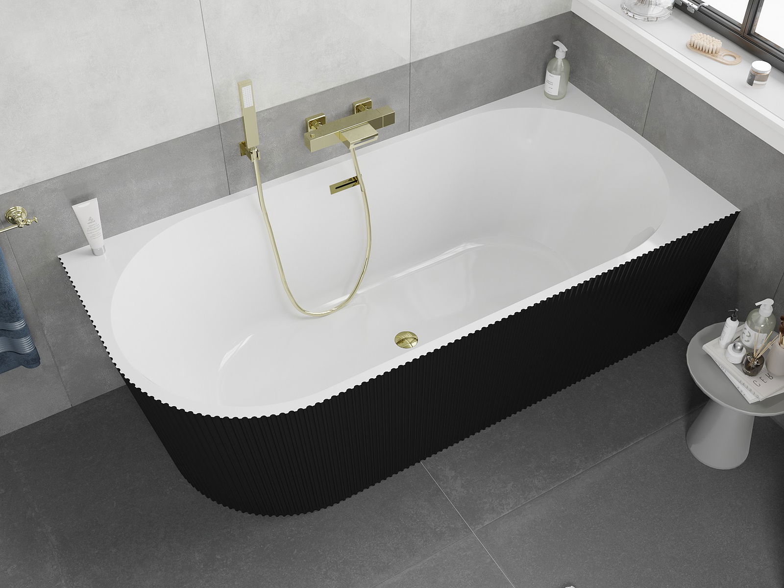 Mexen Silo cadă freestanding colț dreapta canelată 150 x 75 cm, albă/neagră, preaplin auriu - 52891507575P-50