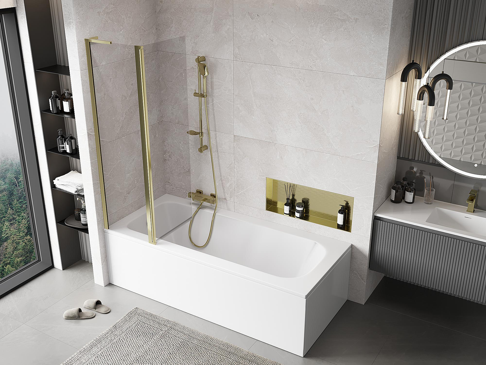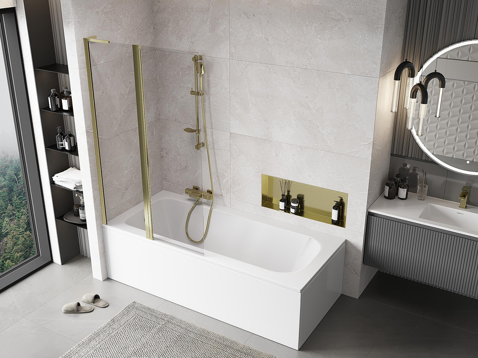 Paravan realizat din două uși cu posibilitatea de pliere. Această soluție permite economisirea mai mult spațiu în baie și permite utilizarea liberă a spațiului rămas atunci când nu folosim zona de baie.