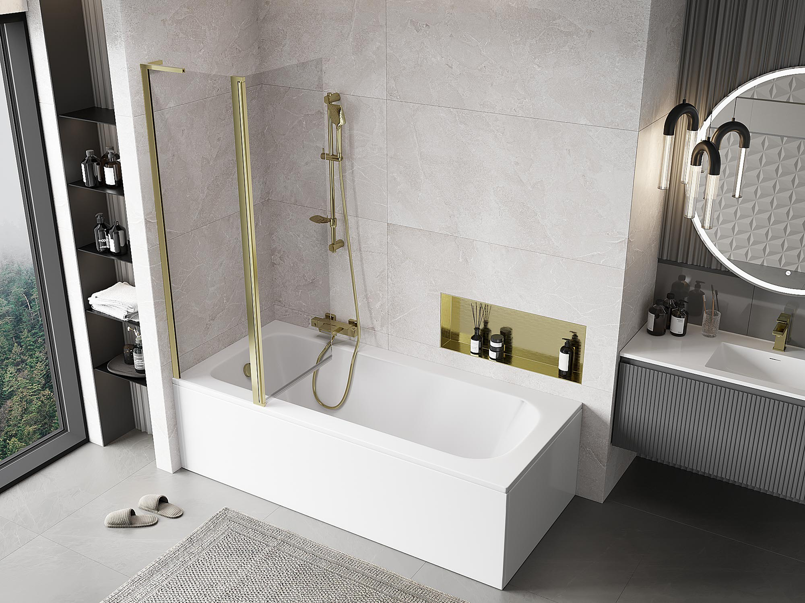Paravan realizat din două uși cu posibilitatea de pliere. Această soluție permite economisirea mai mult spațiu în baie și permite utilizarea liberă a spațiului rămas atunci când nu folosim zona de baie.