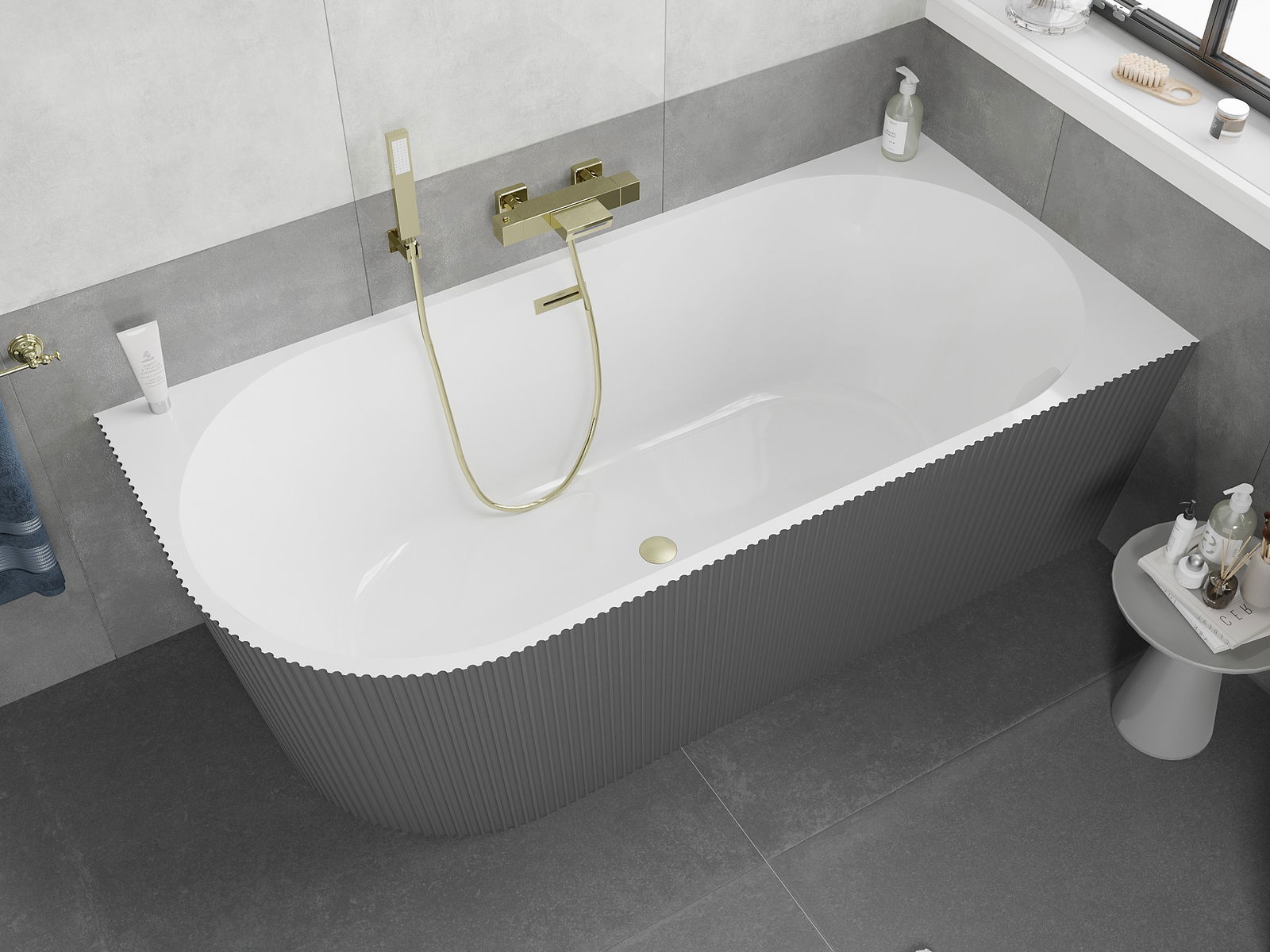Mexen Silo vană de sine stătătoare colț dreapta cu reliefuri 150 x 75 cm, alb/gri, preaplin aurit periat - 52891507562P-55