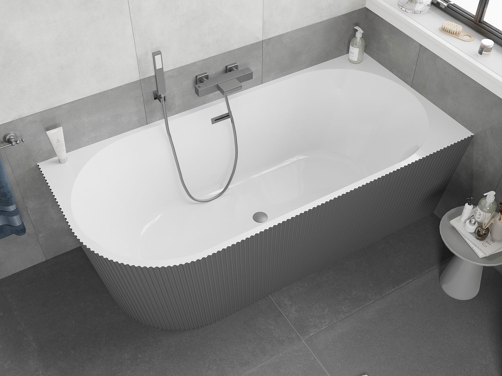 Mexen Silo cadă freestanding colț dreapta canelată 170 x 80 cm, albă/gri, preaplin gun metal - 52891708062P-95
