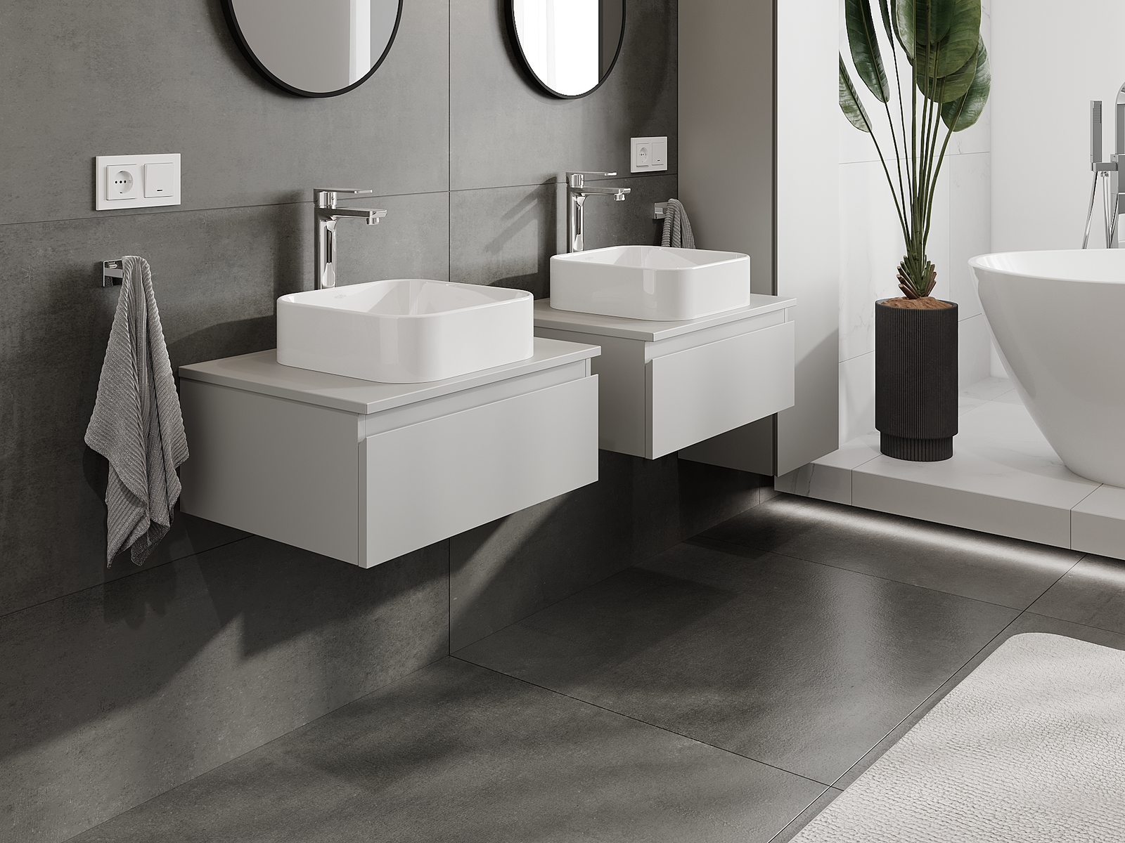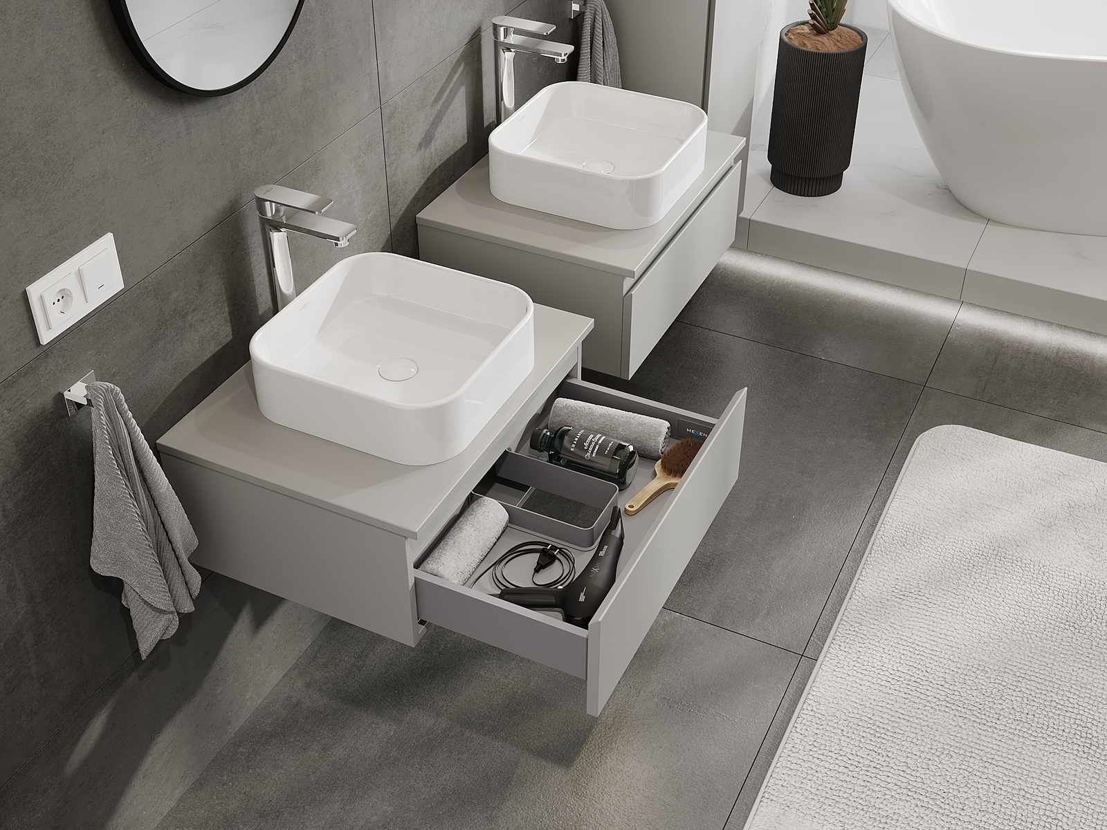 Mobilierul nostru modular pentru baie poate fi combinat în diverse configurații de culori, permițând personalizarea completă. Puteți alege atât aspectul, cât și funcțiile fiecărui element, ceea ce permite adaptarea mobilierului la preferințele dvs. stilistice și funcționale.
