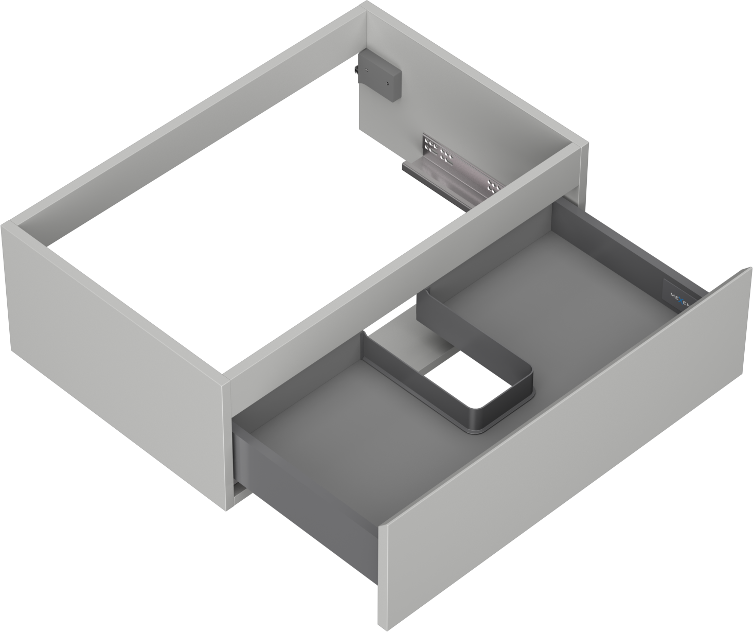Decupajul în sertar este proiectat în așa fel încât să acomodeze sifonul, care este esențial în instalațiile de lavoare. Datorită acestui fapt, mobila poate fi montată complet funcțională, fără a fi necesară renunțarea la spațiul din sertar în favoarea instalației.