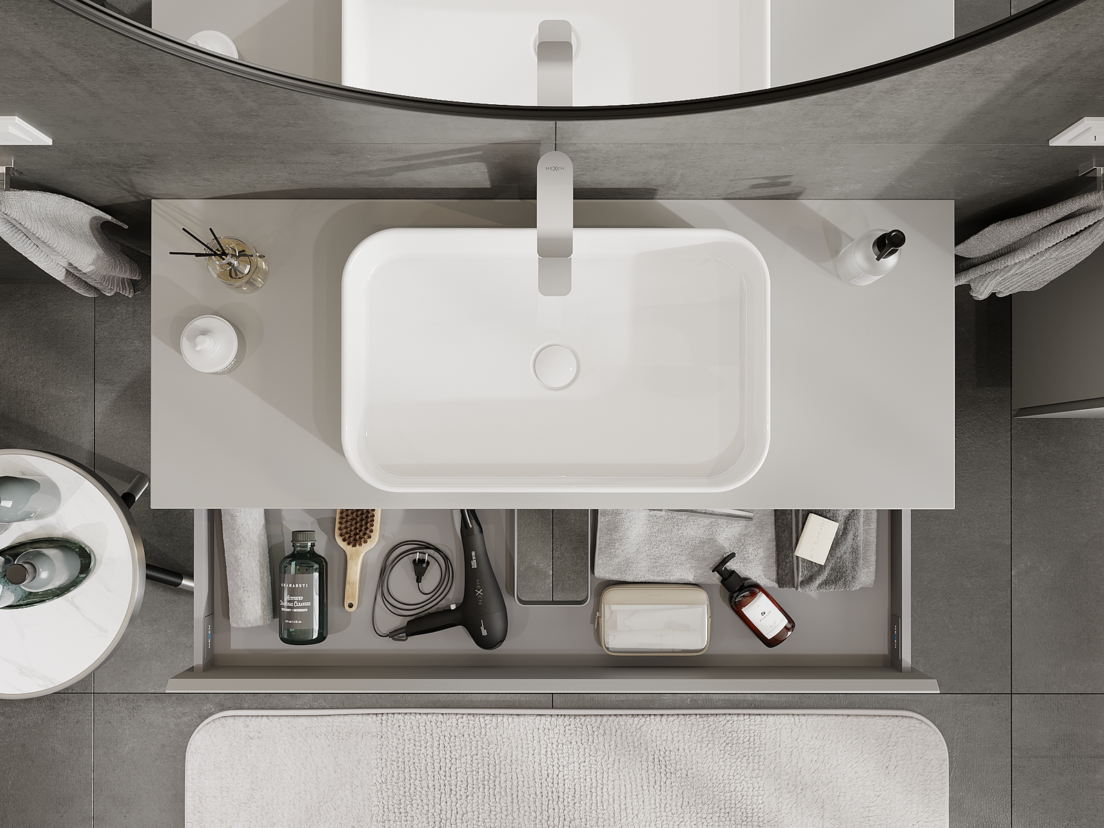Decupajul în sertar este proiectat în așa fel încât să acomodeze sifonul, care este esențial în instalațiile de lavoare. Datorită acestui fapt, mobila poate fi montată complet funcțională, fără a fi necesară renunțarea la spațiul din sertar în favoarea instalației.