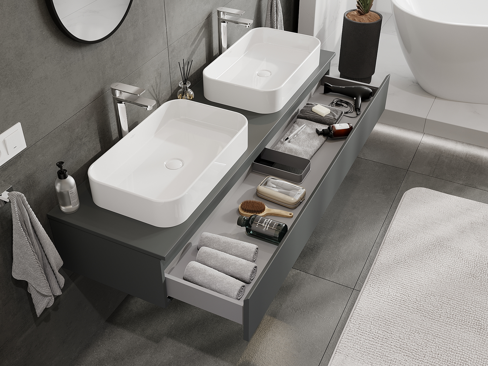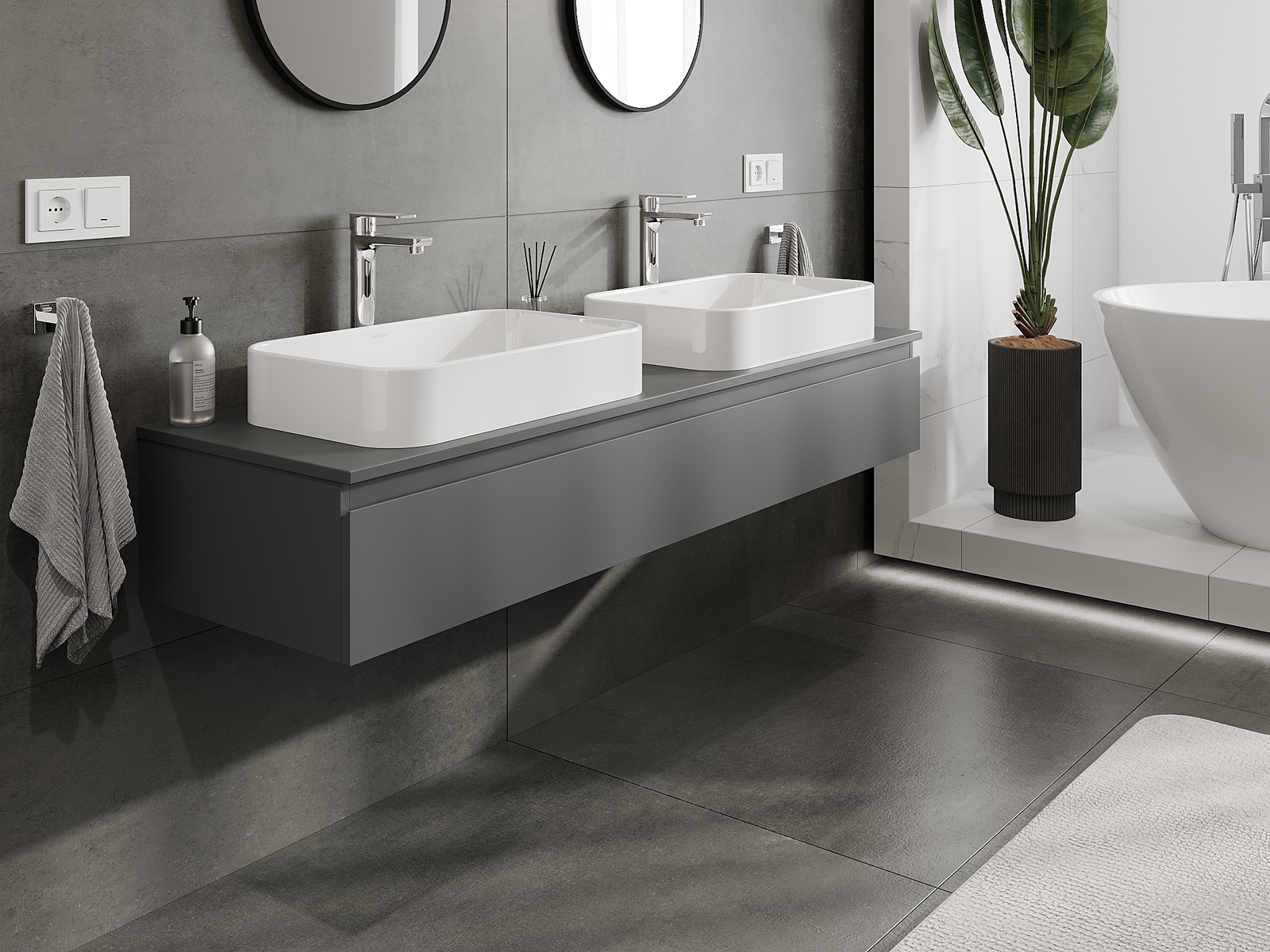 Mobilierul nostru modular pentru baie poate fi combinat în diverse configurații de culori, permițând personalizarea completă. Puteți alege atât aspectul, cât și funcțiile fiecărui element, ceea ce permite adaptarea mobilierului la preferințele dvs. stilistice și funcționale.
