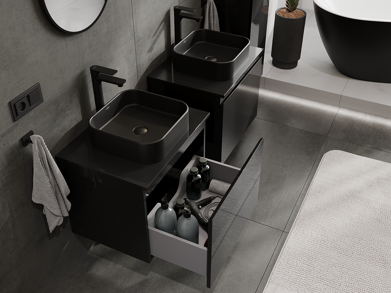 Mobilierul nostru modular pentru baie poate fi combinat în diverse configurații de culori, permițând personalizarea completă. Puteți alege atât aspectul, cât și funcțiile fiecărui element, ceea ce permite adaptarea mobilierului la preferințele dvs. stilistice și funcționale.