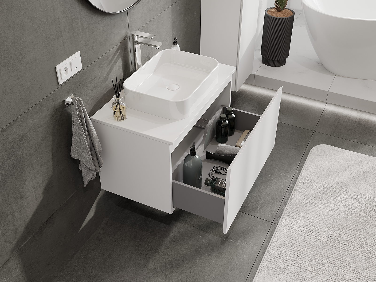 Mobilierul nostru modular pentru baie poate fi combinat în diverse configurații de culori, permițând personalizarea completă. Puteți alege atât aspectul, cât și funcțiile fiecărui element, ceea ce permite adaptarea mobilierului la preferințele dvs. stilistice și funcționale.