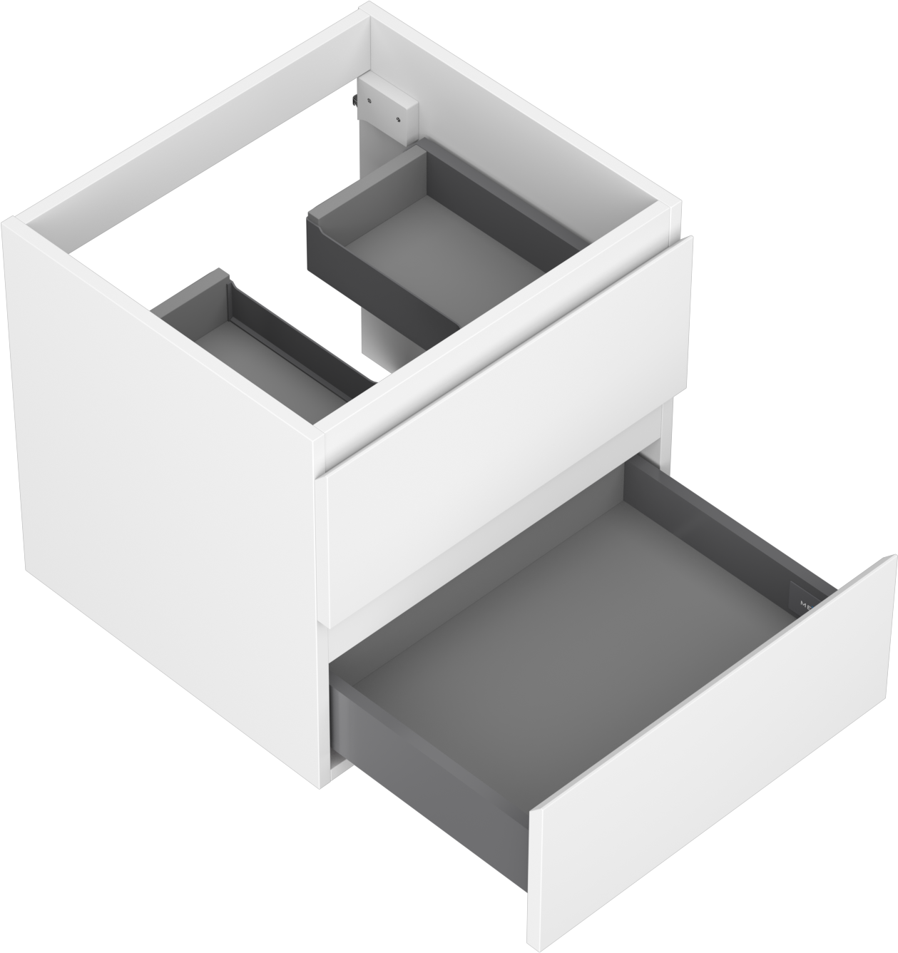 Decupajul în sertar este proiectat în așa fel încât să acomodeze sifonul, care este esențial în instalațiile de lavoare. Datorită acestui fapt, mobila poate fi montată complet funcțională, fără a fi necesară renunțarea la spațiul din sertar în favoarea instalației.