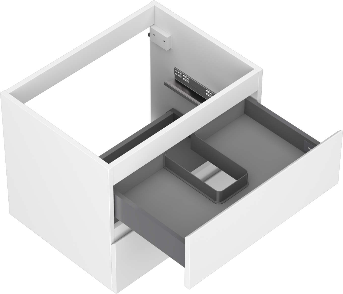 Decupajul în sertar este proiectat în așa fel încât să acomodeze sifonul, care este esențial în instalațiile de lavoare. Datorită acestui fapt, mobila poate fi montată complet funcțională, fără a fi necesară renunțarea la spațiul din sertar în favoarea instalației.