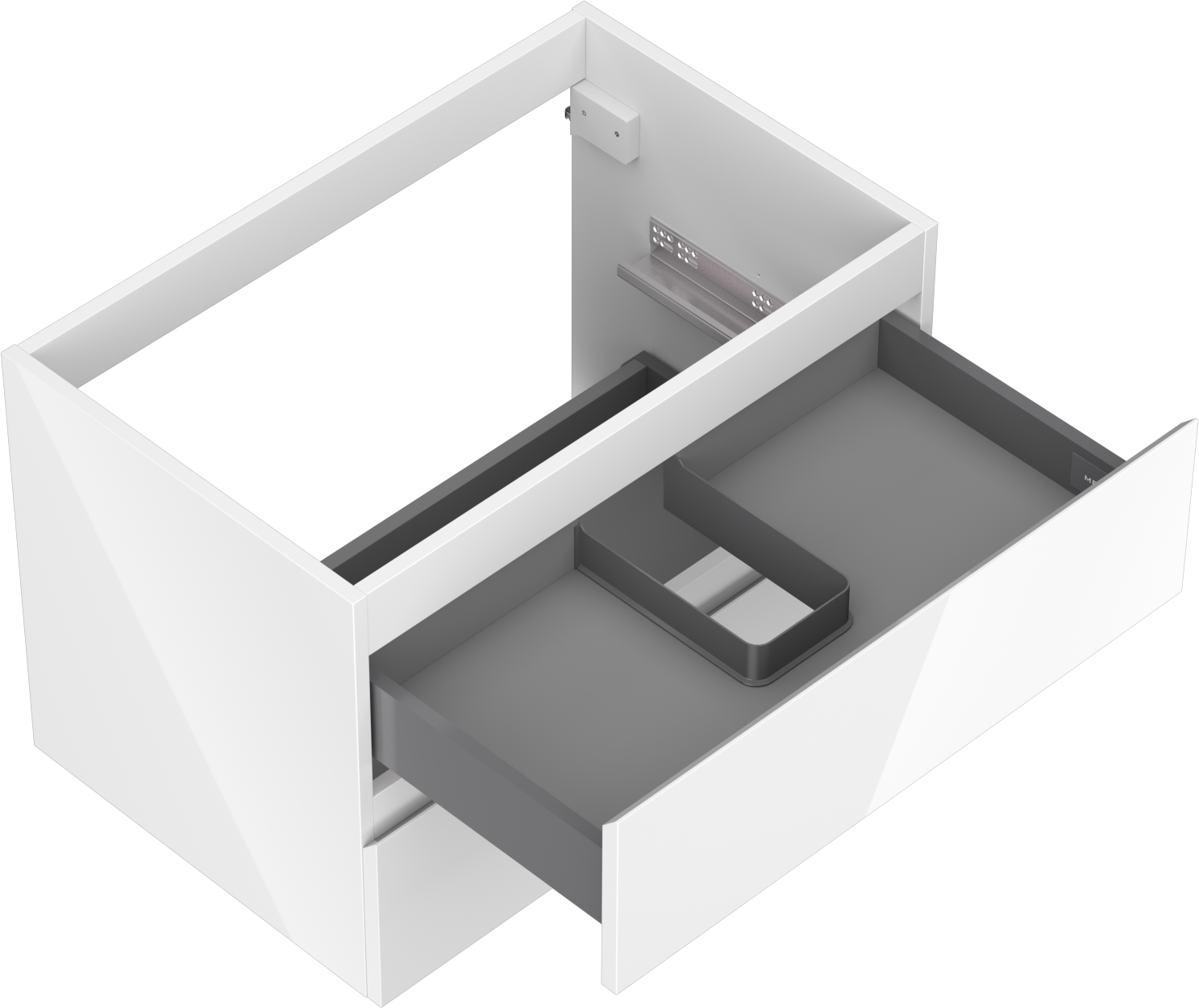 Decupajul în sertar este proiectat în așa fel încât să acomodeze sifonul, care este esențial în instalațiile de lavoare. Datorită acestui fapt, mobila poate fi montată complet funcțională, fără a fi necesară renunțarea la spațiul din sertar în favoarea instalației.