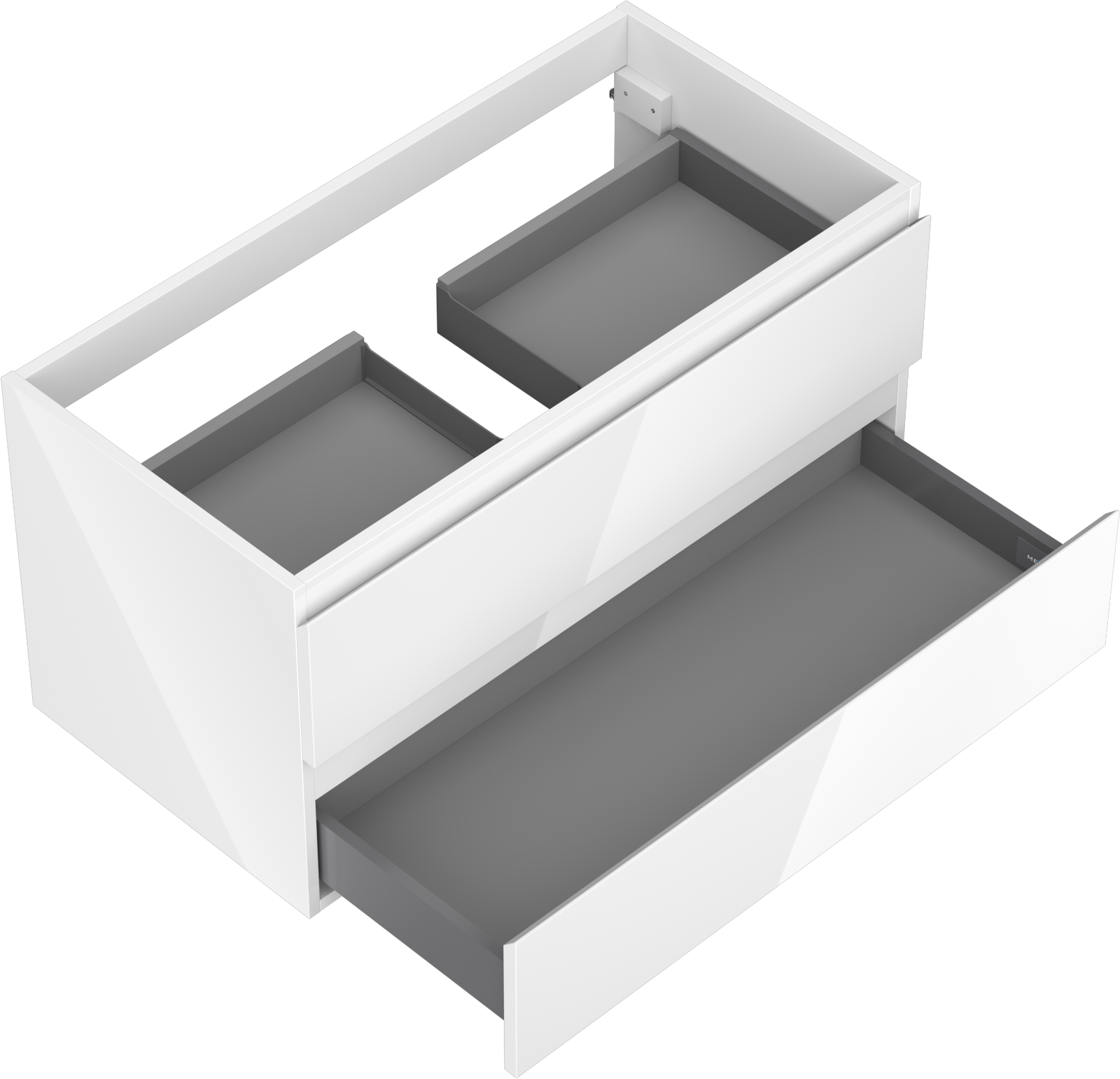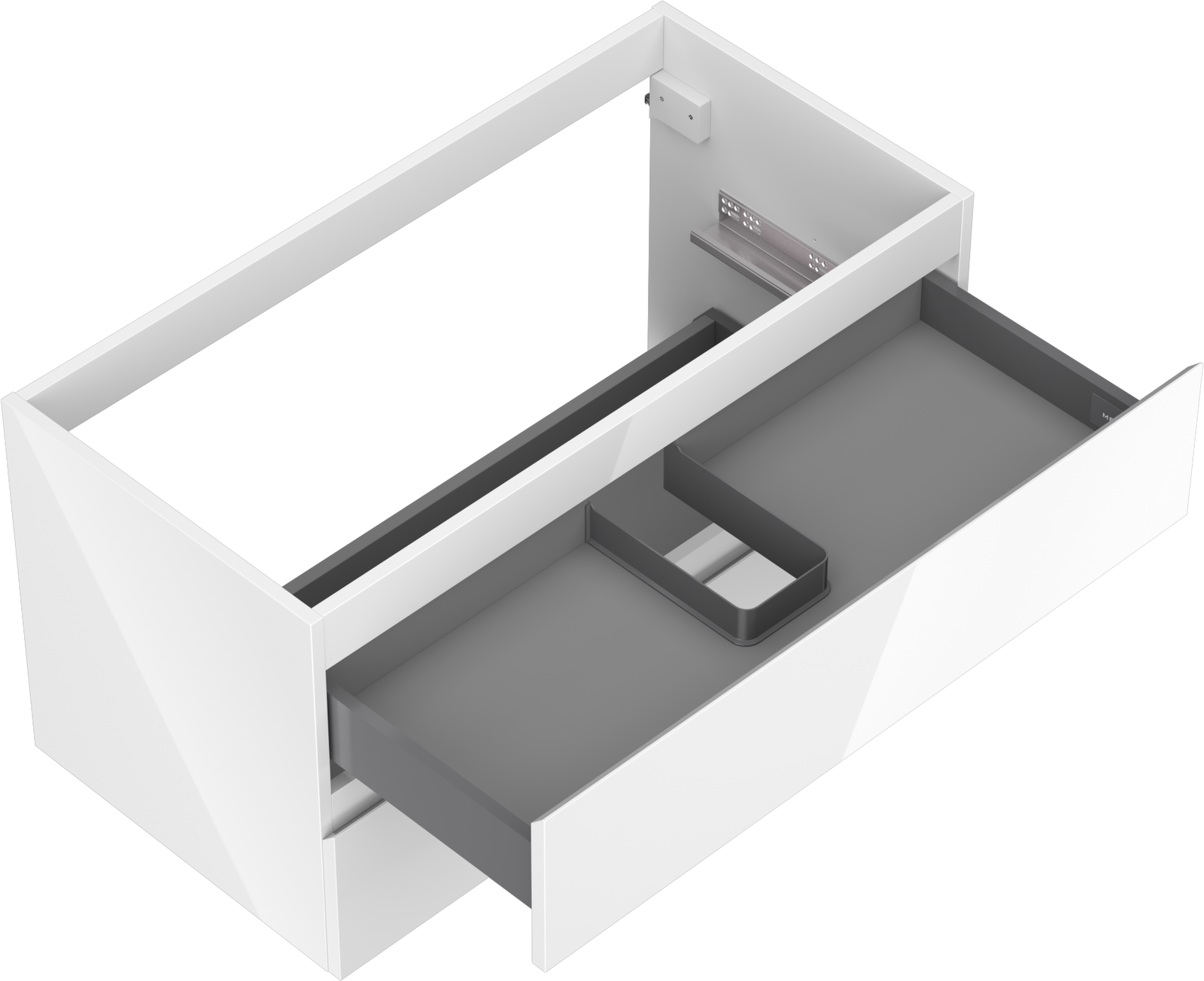 Decupajul în sertar este proiectat în așa fel încât să acomodeze sifonul, care este esențial în instalațiile de lavoare. Datorită acestui fapt, mobila poate fi montată complet funcțională, fără a fi necesară renunțarea la spațiul din sertar în favoarea instalației.